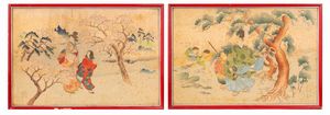 cm 34,5 x 50 Giappone, inizio secolo XX raffiguranti due dame in un paesaggio con alberi di ciliegio; e un dignitario [..]