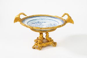 cm 17,5 x 30 base in bronzo dorato con tre delfini e prese a forma di draghi, piatto in porcellana bianca e blu [..]
