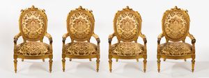 cm 116 x 67,5 x 56 ciascuna schienale decorato da fregi a volute fogliate e fenici, centrato da volto muliebre, [..]