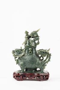 cm 17,5 x 30 base in bronzo dorato con tre delfini e prese a forma di draghi, piatto in porcellana bianca e blu [..]