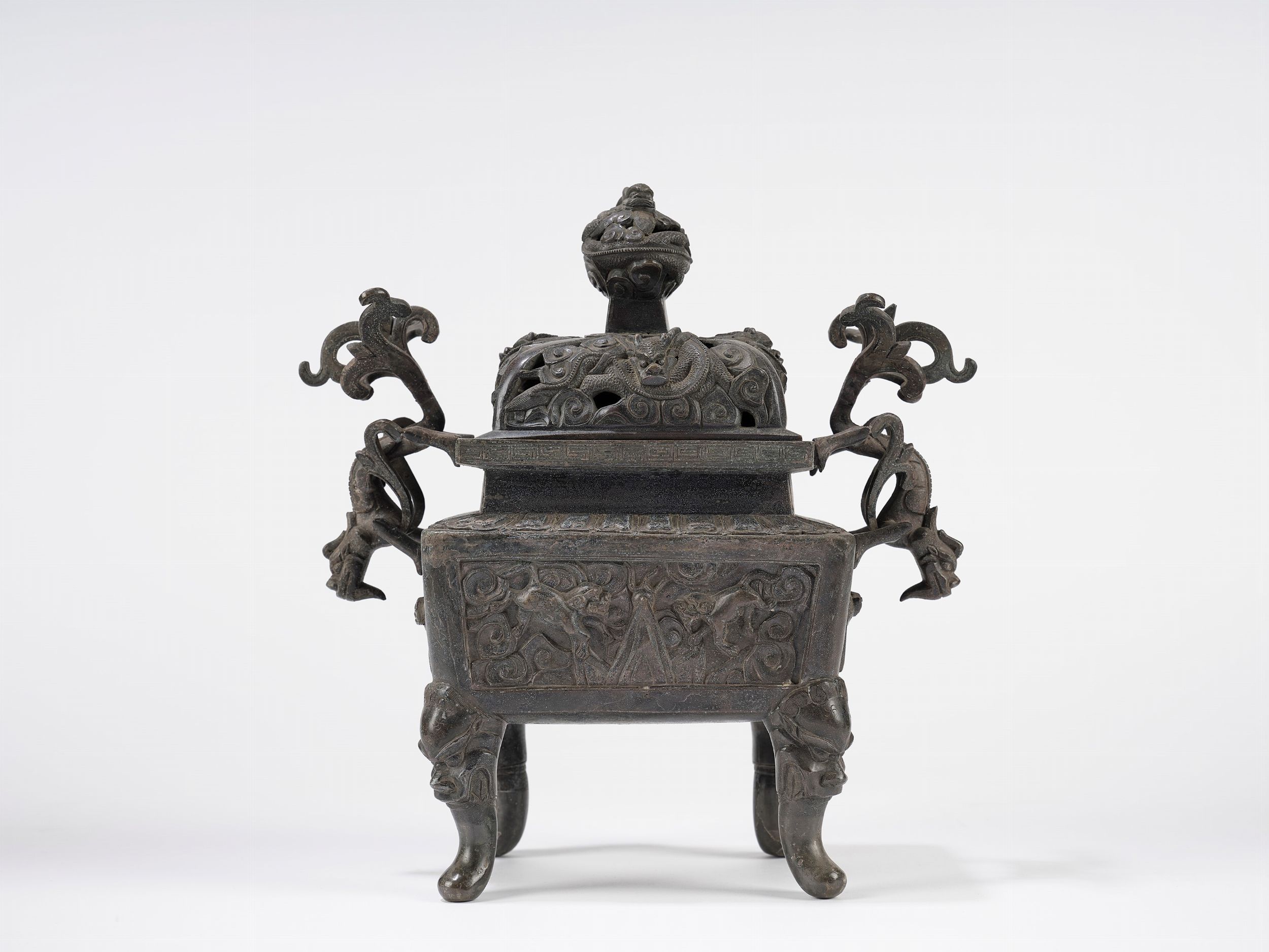 h cm 33 Cina, XIX secolo di forma arcaica 'Fang/Ding', con quattro piedini terminanti in mascheroni, il corpo centrale rettangolare con due kirin tra nuvole stilizzate; anse con animali fantastici e code a guisa di fiore, il coperchio e la presa con drago attorcigliato tra nuvole, marcato alla base 青铜香炉,中国,十九世纪