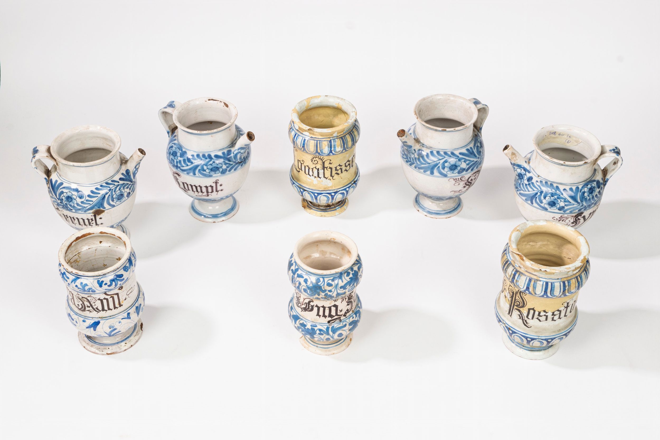 secolo XVIII corpi decorati in monocromia blu a volute fogliate e baccellature centrati da cartigli con scritte apotecarie (difetti, mancanze e restauri)