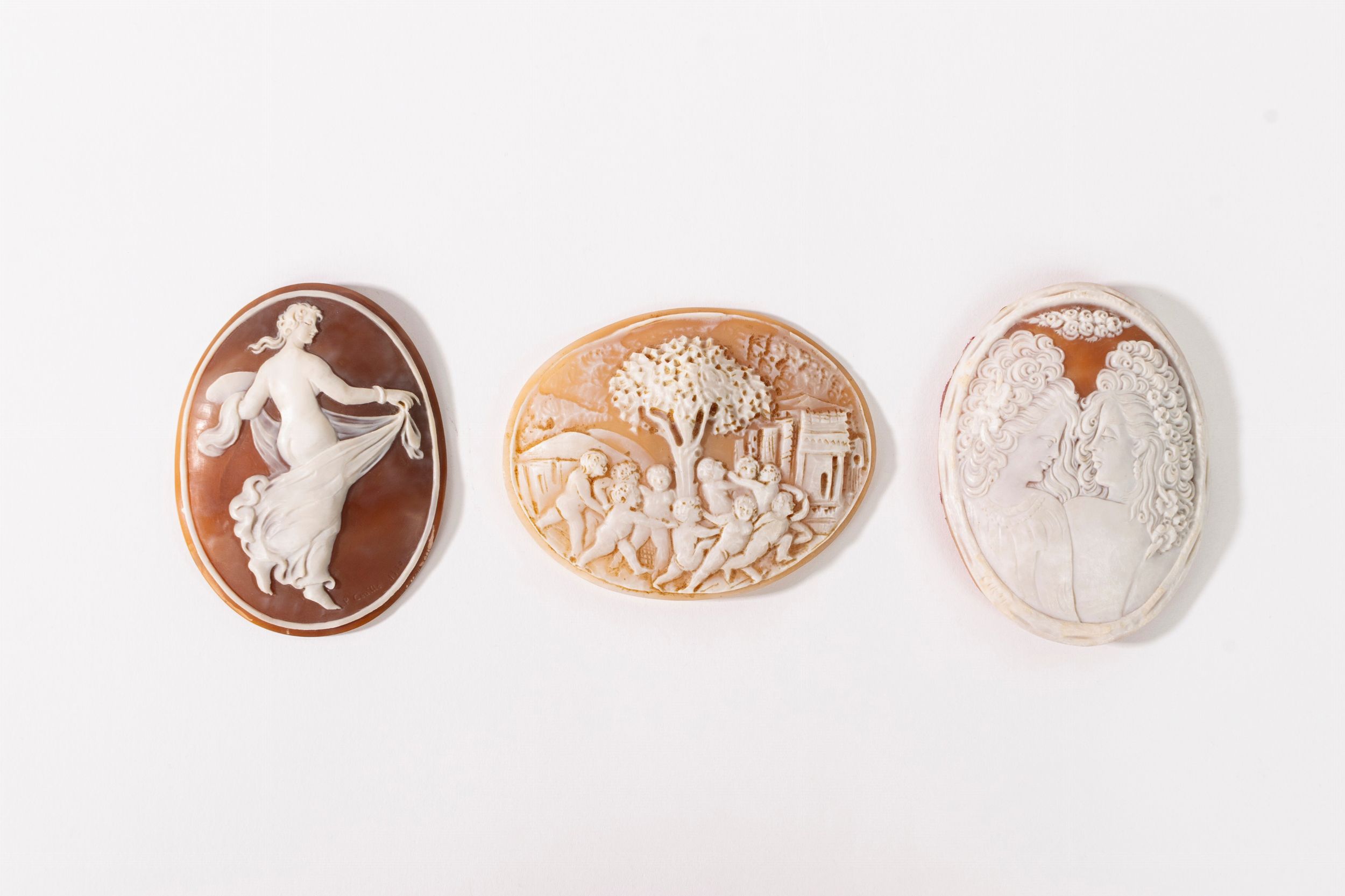 uno con figura femminile danzante, uno con due profili di donna e uno con giochi di putti