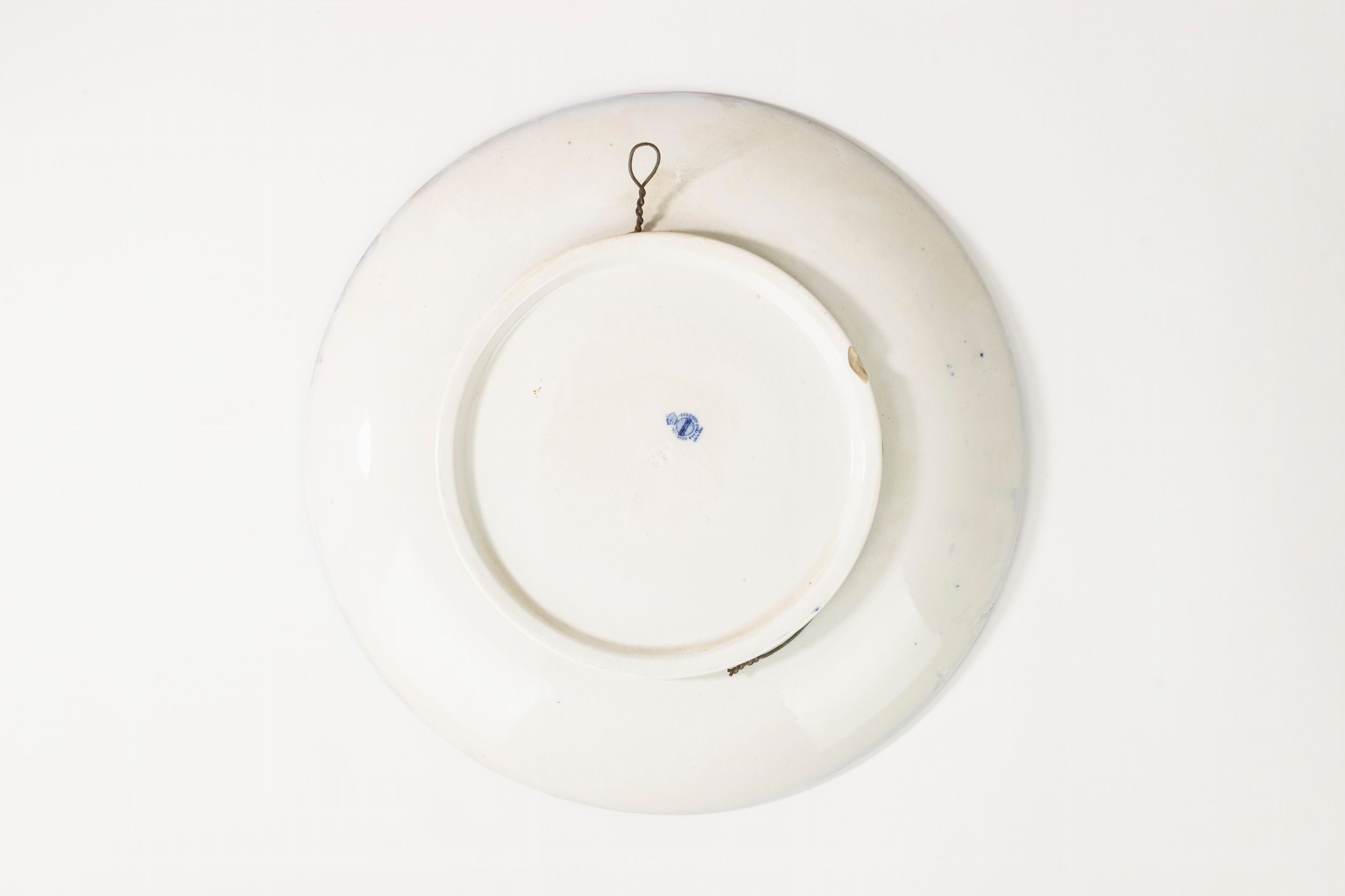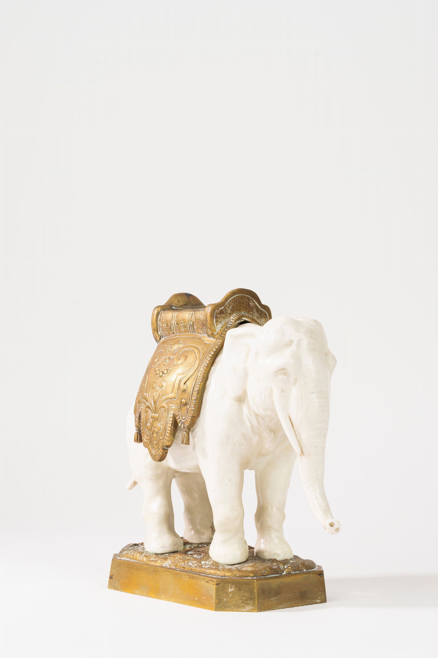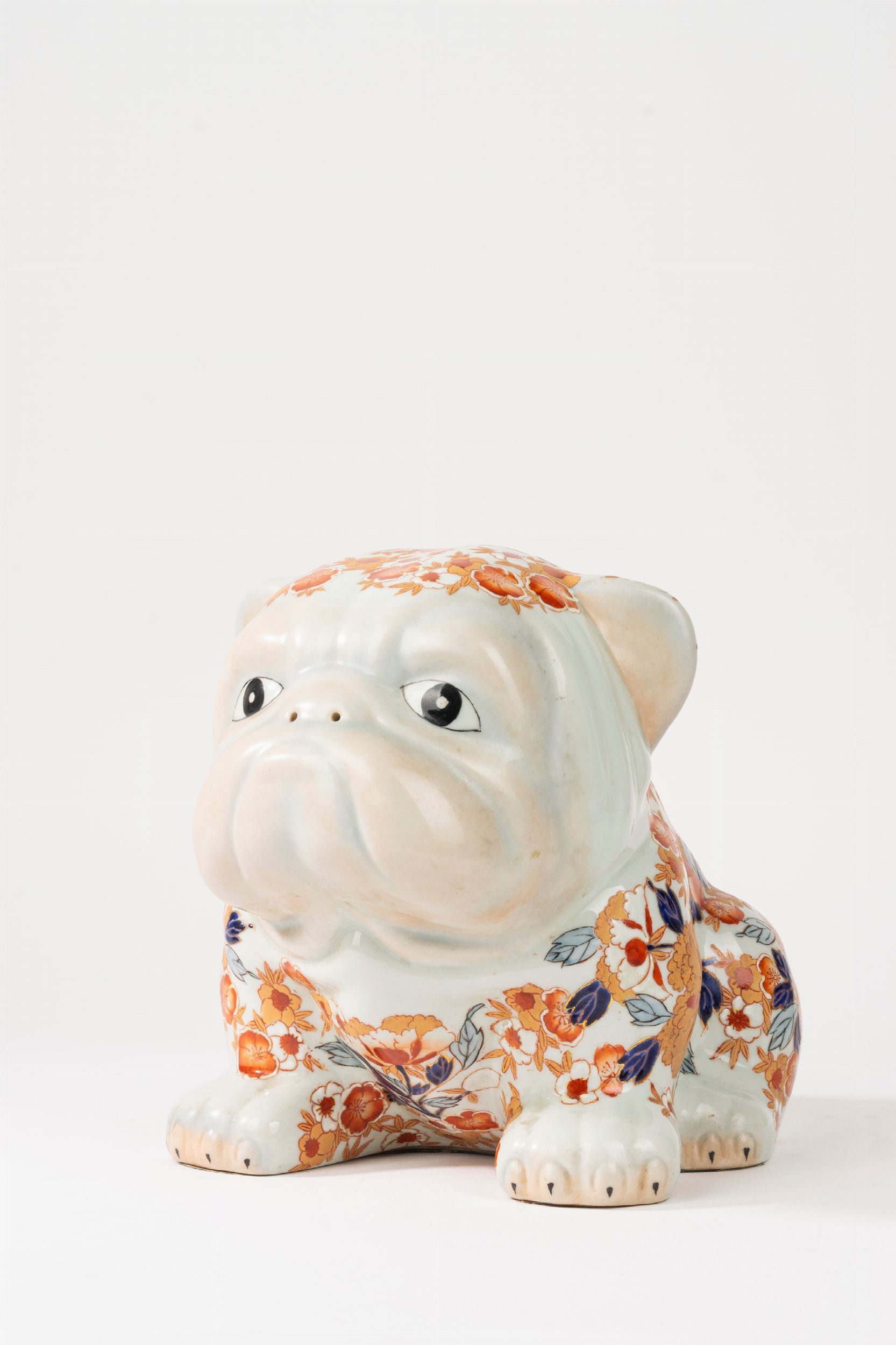 diametro cm 38 (piatto); cm 21 x 18 x 26 (cane); cm 21 x 22 x 10,5 (elefante) un piatto bianco e blu, Inghilterra, secolo XX; una scultura raffigurante bull dog decorato in policromia in stile Imari, Giappone, secolo XX; un elefante in ceramica bianca con base e sella in metallo dorato lievi difetti
