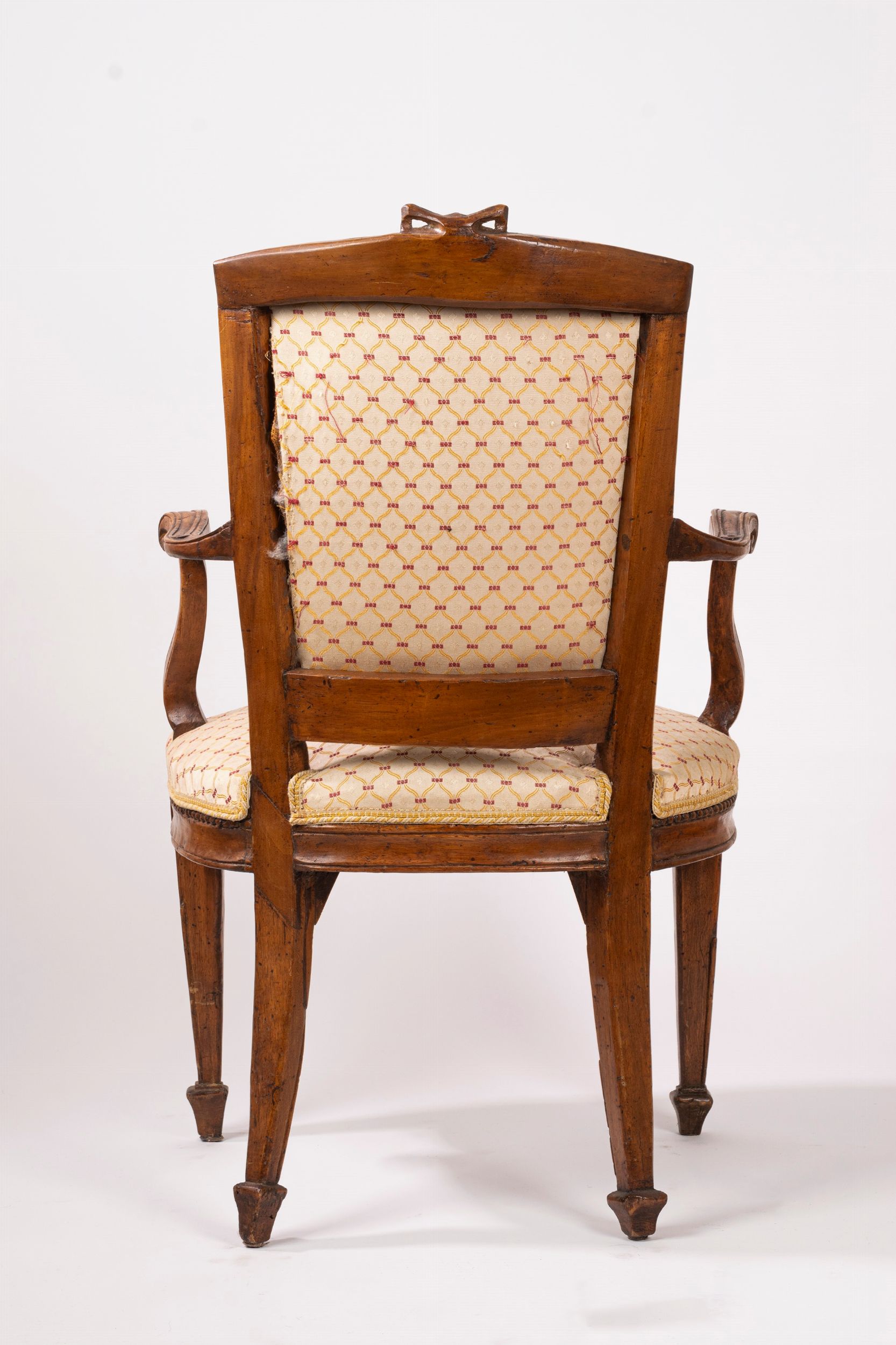 cm 88 x 55 x 50 (la coppia); cm 88 x 61,5 x 43 (la singola) con gambe rastremate con motivo floreale all'attacco, montanti mossi, braccioli terminanti a ricciolo e schienale di forma squadrata difetti e restauri