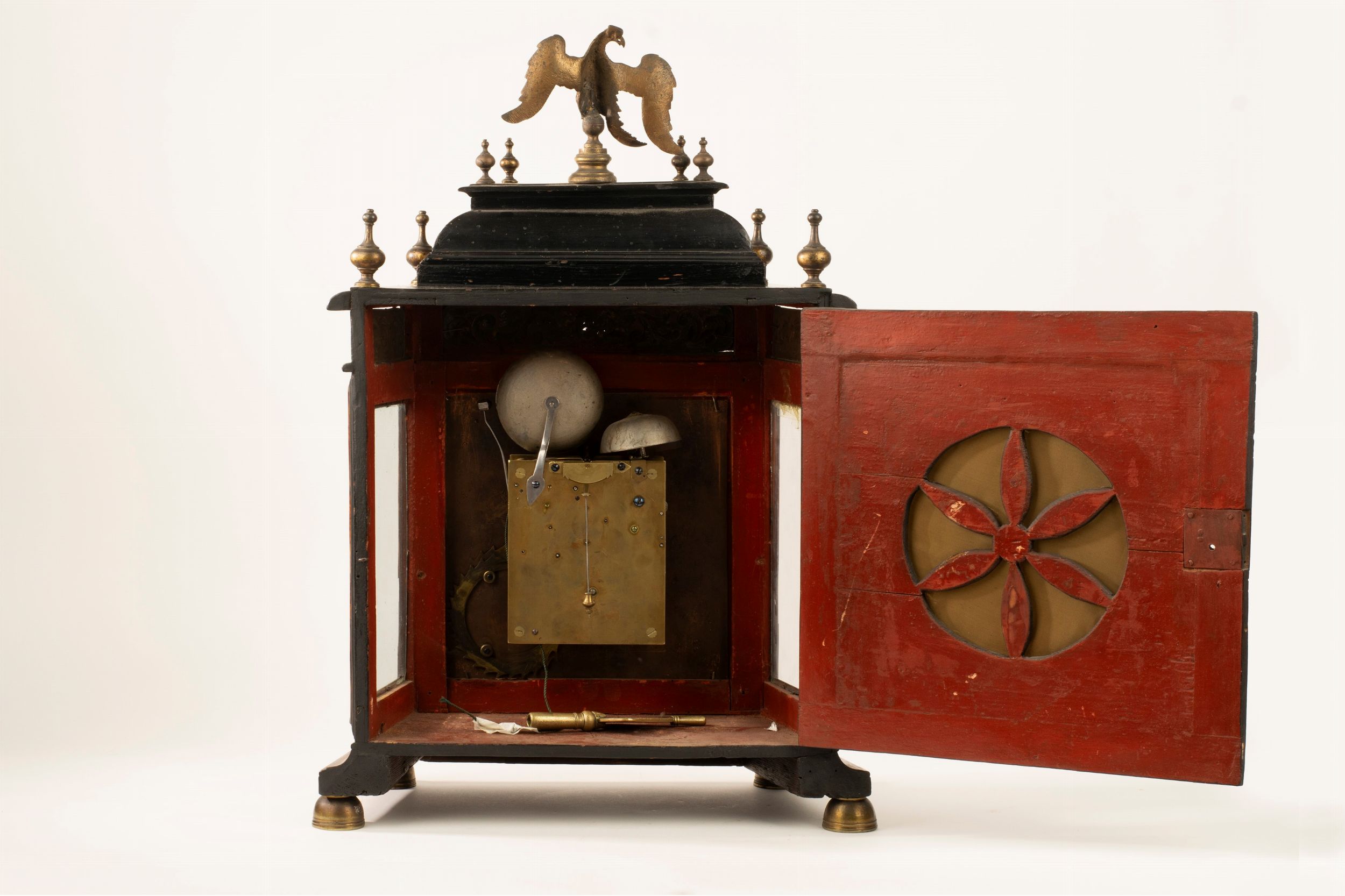 cm 60x42x20 parzialmente lastronata in tartaruga, la fascia superiore decorata da fregio dorato sbalzato a volute, sormontata da aquila tra pinnacoli in metallo dorato. Quadrante a fascia a numeri romani per le ore e arabi per i minuti, movimento a due treni con suoneria delle ore e delle mezze, la mostra sbalzata e incisa a volute fogliate è iscritta 'Nicolaus Magri fecit Panormi' (difetti, restauri e sostituzioni, l'aquila non pertinente) Lotto accompagnato da perizia per la tartaruga Il ricavato delle opere donate da Maria Pia Bossi verrà devoluto a sostegno delle attività di ricerca di Fondazione Humanitas per la Ricerca ETS. Finarte, estranea all'operazione benefica, in relazione al presente lotto percepisce regolarmente dalle parti diritti e commissioni d'asta.