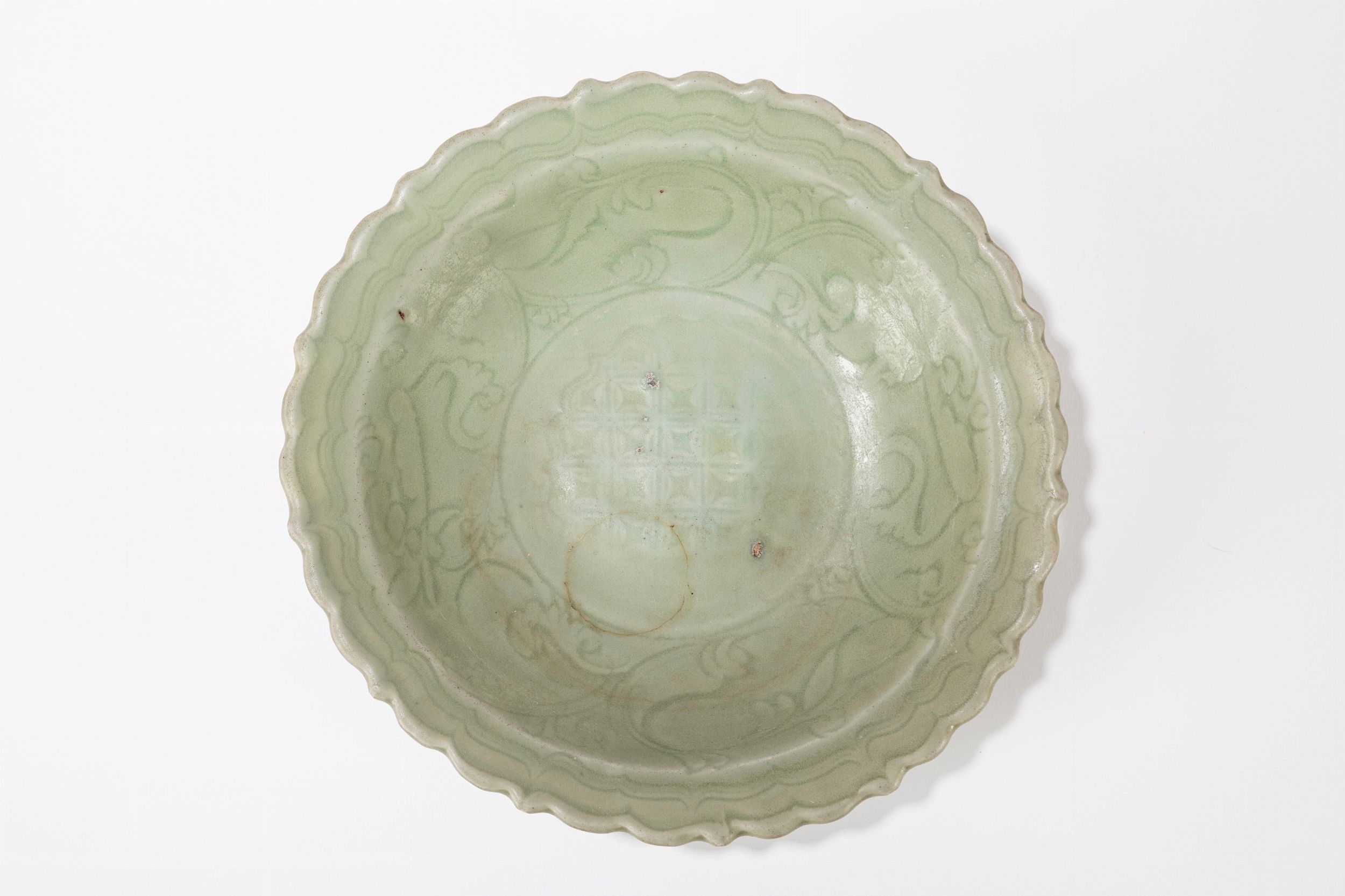 Cina, dinastia Ming (1368-1644) bordo a profilo sagomato, inciso a motivi floreali e fogliacei (difetti)