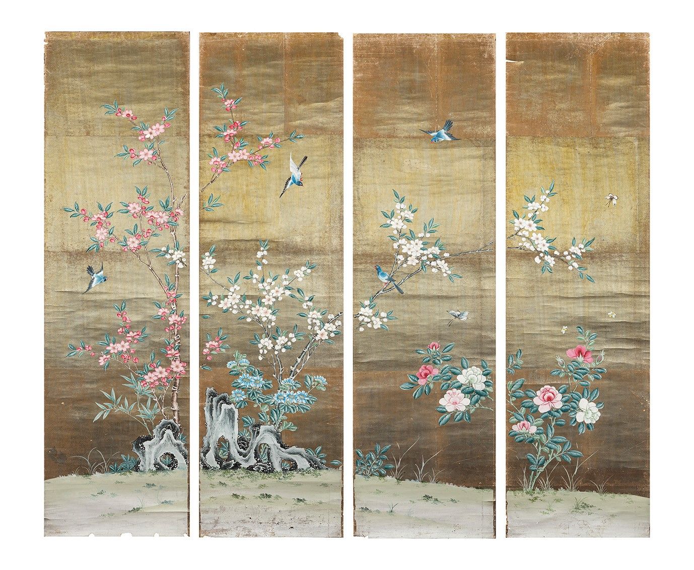 Cina, fine dinastia Qing raffiguranti uccellini in volo in un paesaggio floreale con albero di ciliego, peonie, api e farfalle (difetti) 金箔花鸟画四幅,中国,二十世纪初