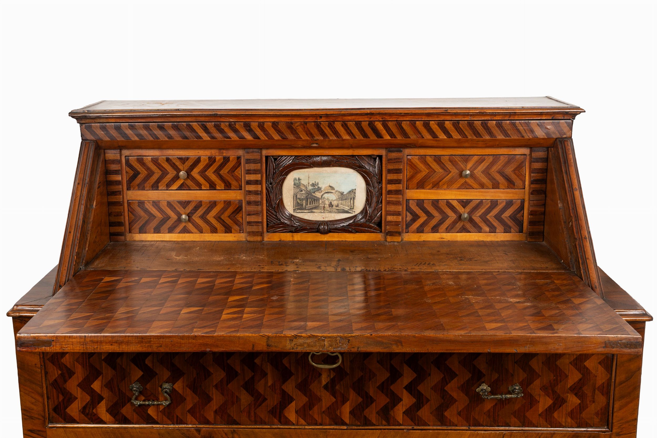 Ribalta in legno intarsiato a motivi geometrici, secolo XVIII