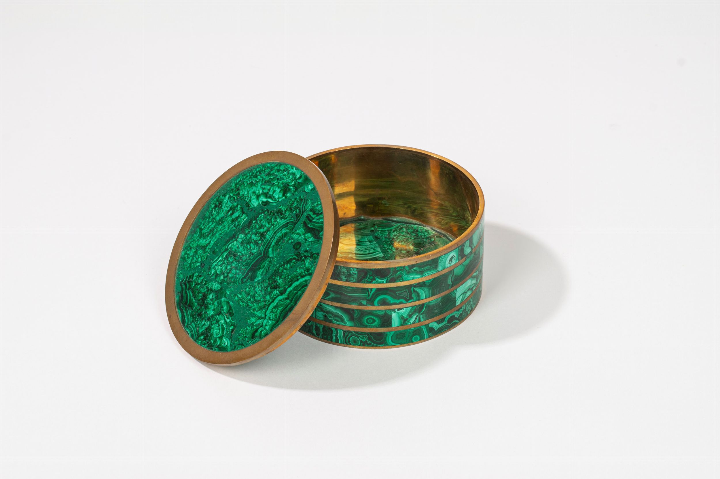 Scatola circolare in malachite e bronzo con coperchio, secolo XX
