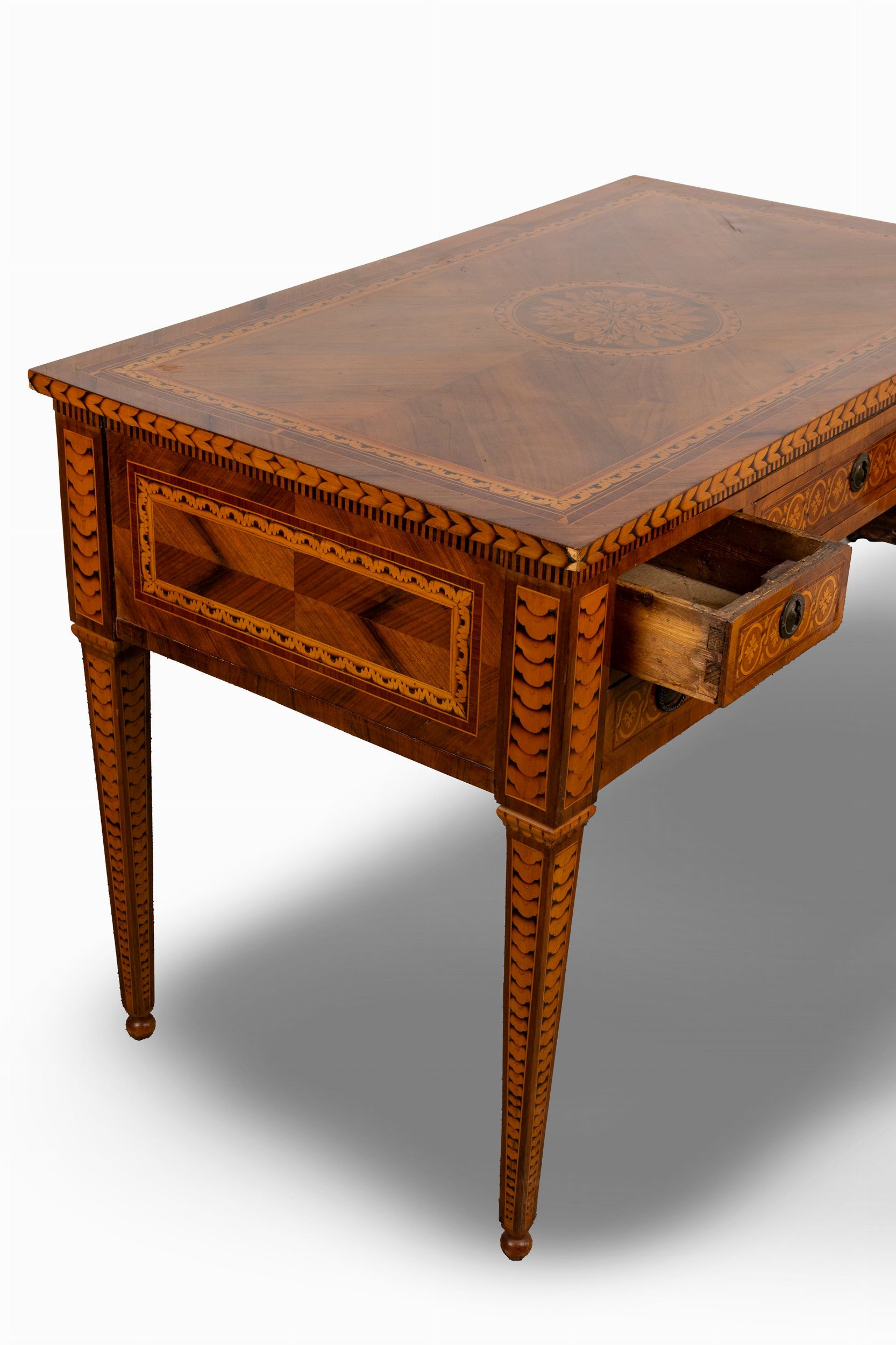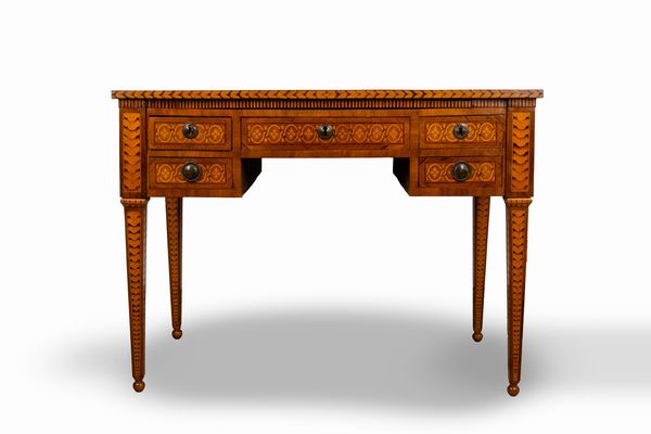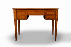 Scrivania da centro lastronata, filettata e intarsiata