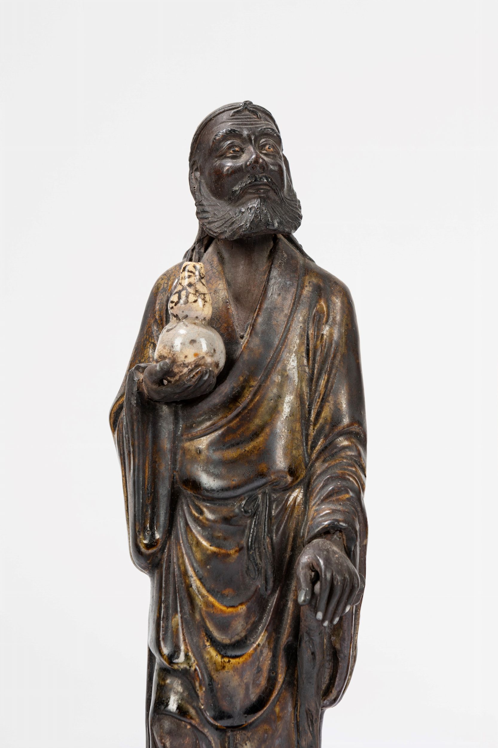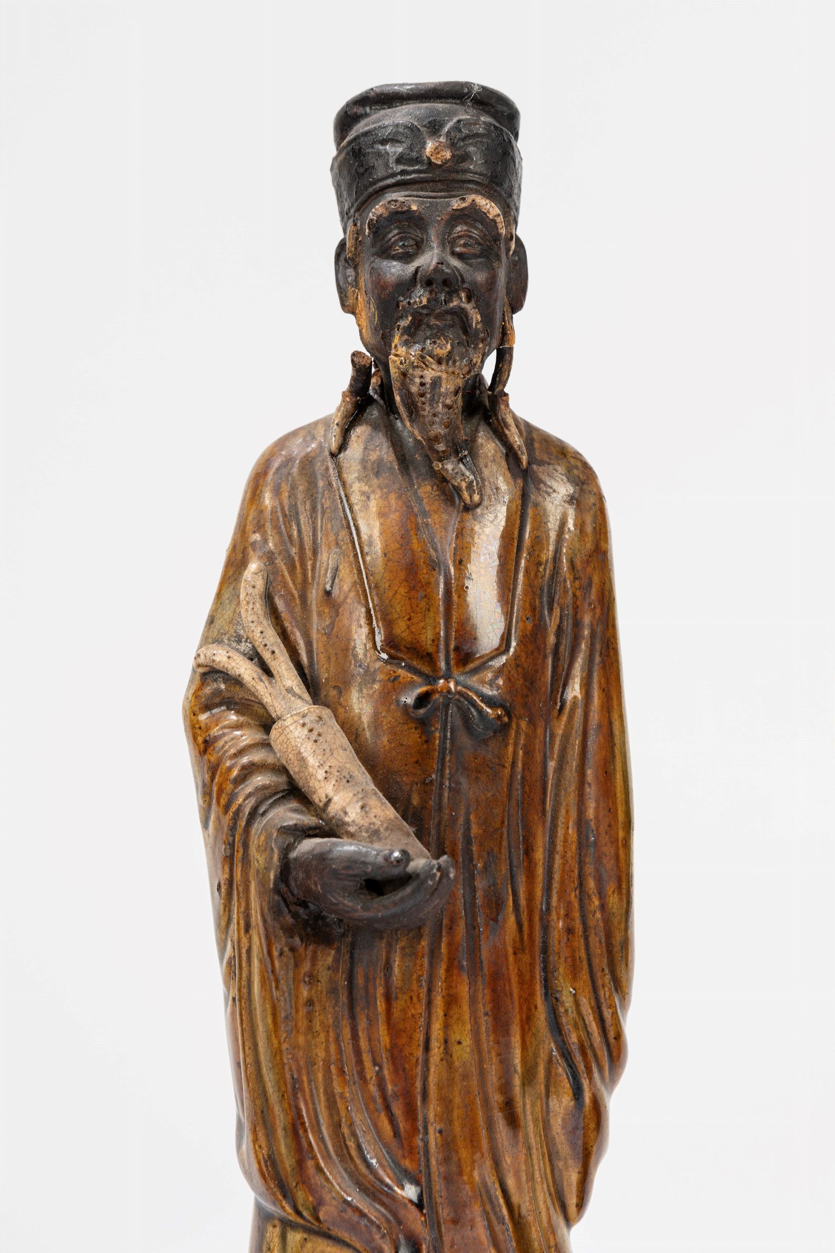 Cina, secolo XIX invetriati e smaltati, raffigurano sei degli Otto Immortali abbigliati nei costumi tradizionali, con basi in legno a finto terreno (difetti) 石湾窑陶瓷凋塑六件,印度,19世纪