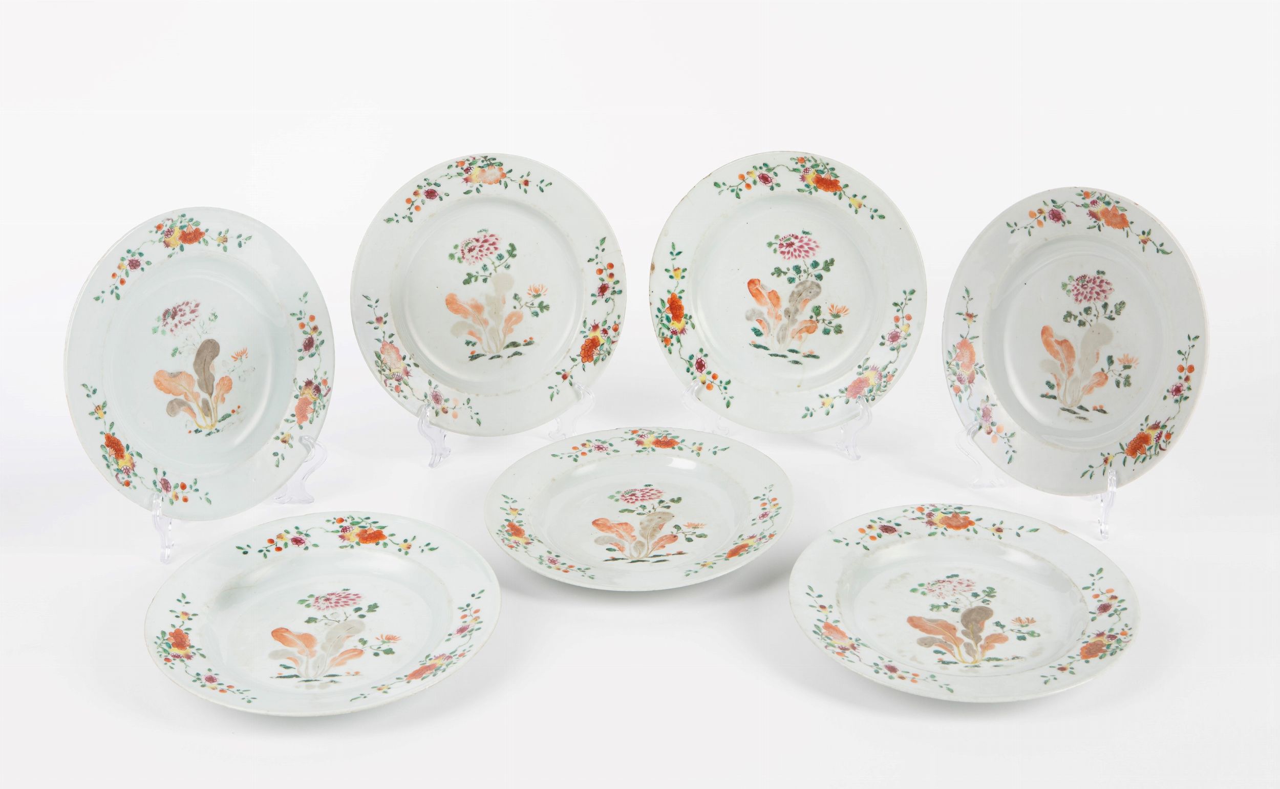 Cina, secolo XVIII decorati con motivi floreali (difetti) 出口陶瓷盘一组七只,中国,十八世纪