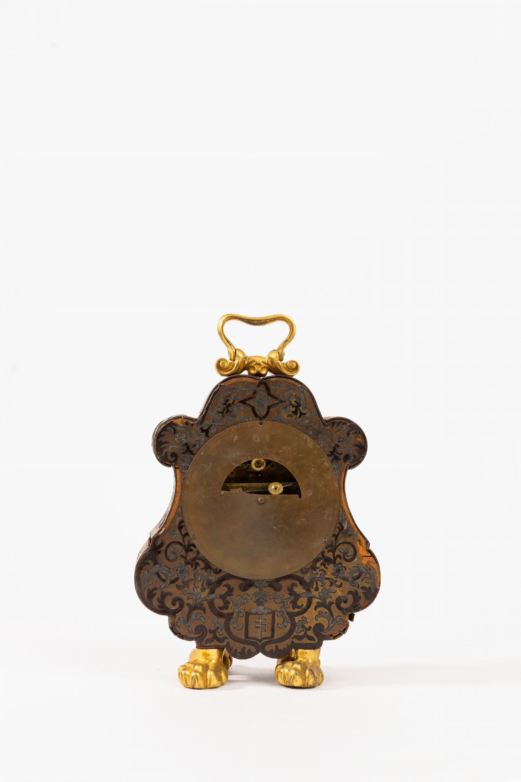 Sveglia da viaggio di forma mossa in legno e bronzo, secolo XIX