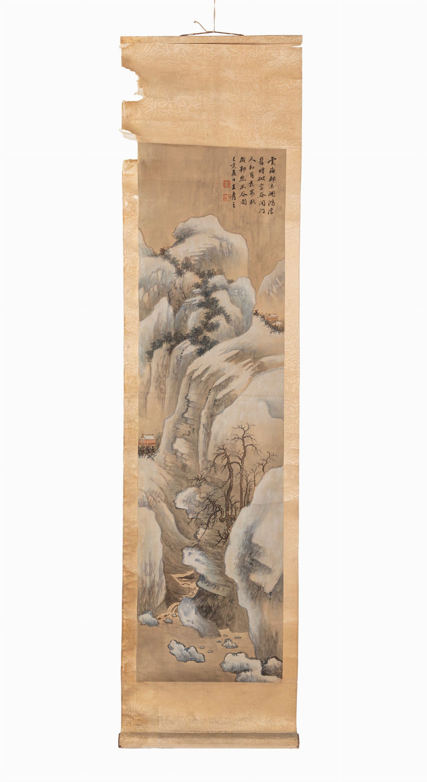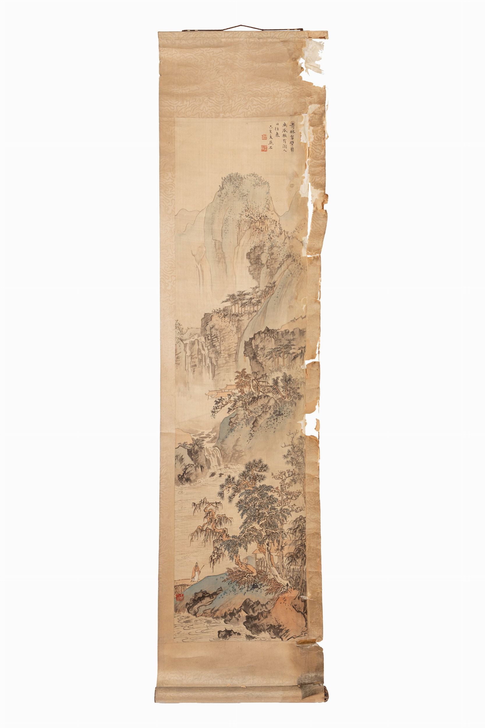 Cina, secolo XX Raffiguranti paesaggi montani con pagode, alberi e fiumi (difetti e strappi)
