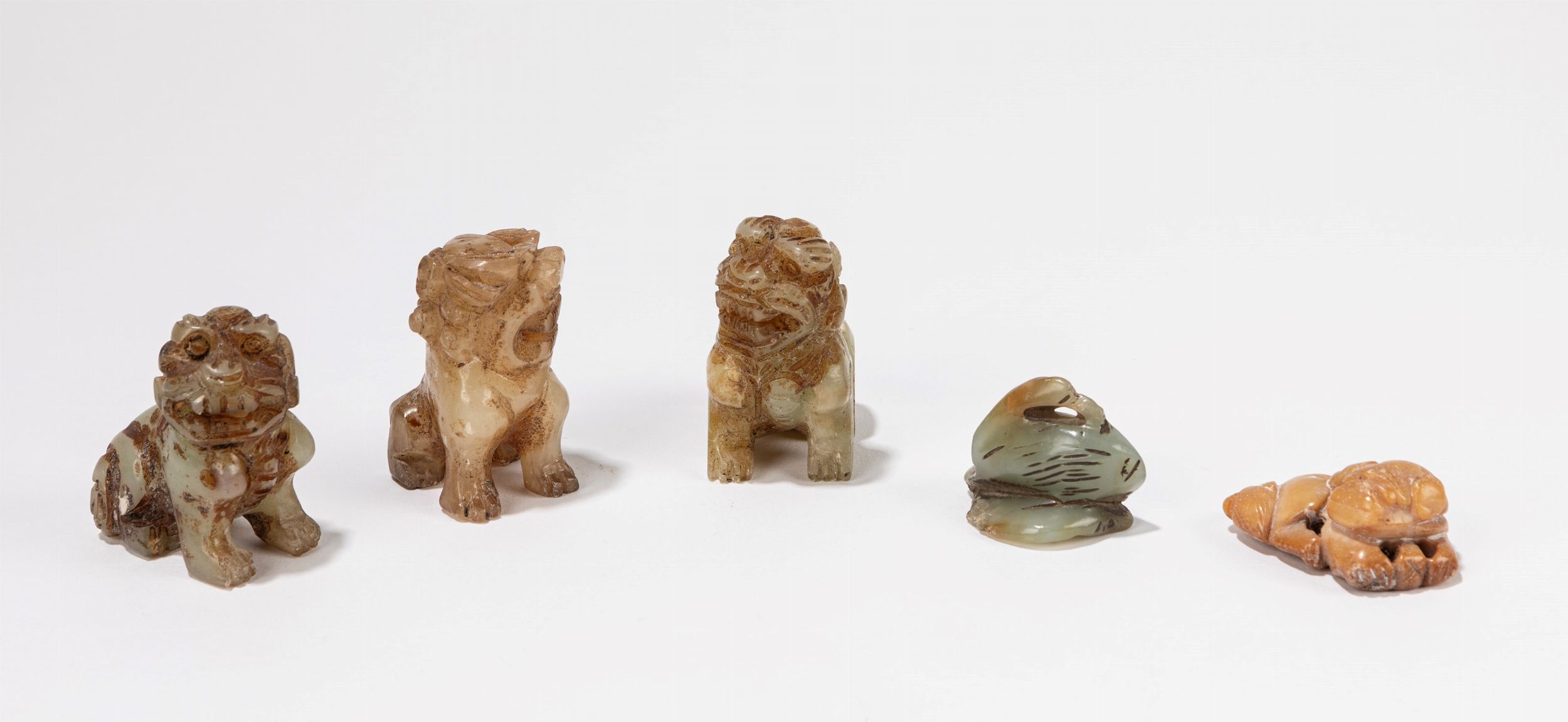 TRE LEONI, UN CANE E UN'ANATRA IN PIETRA DURA/GIADA