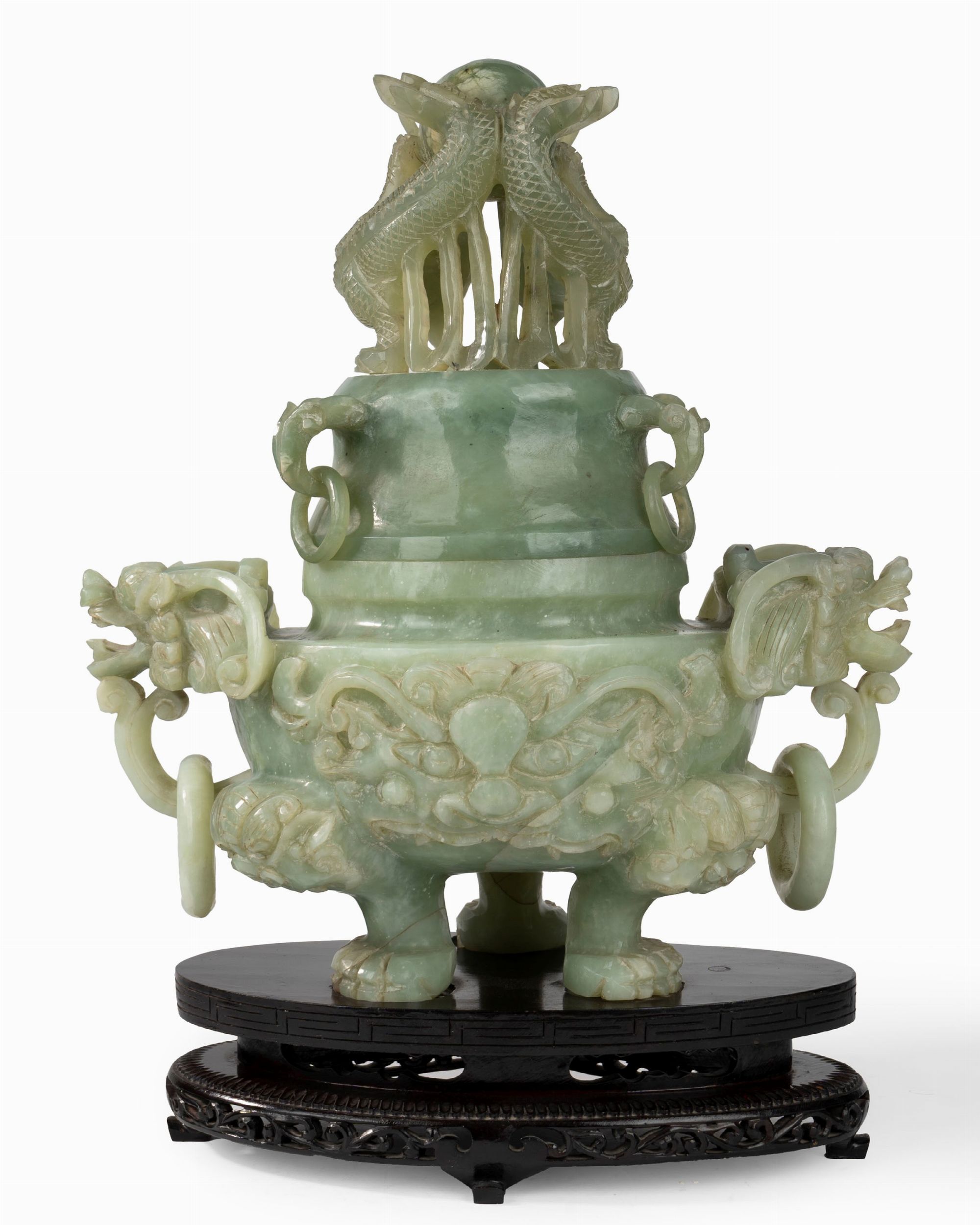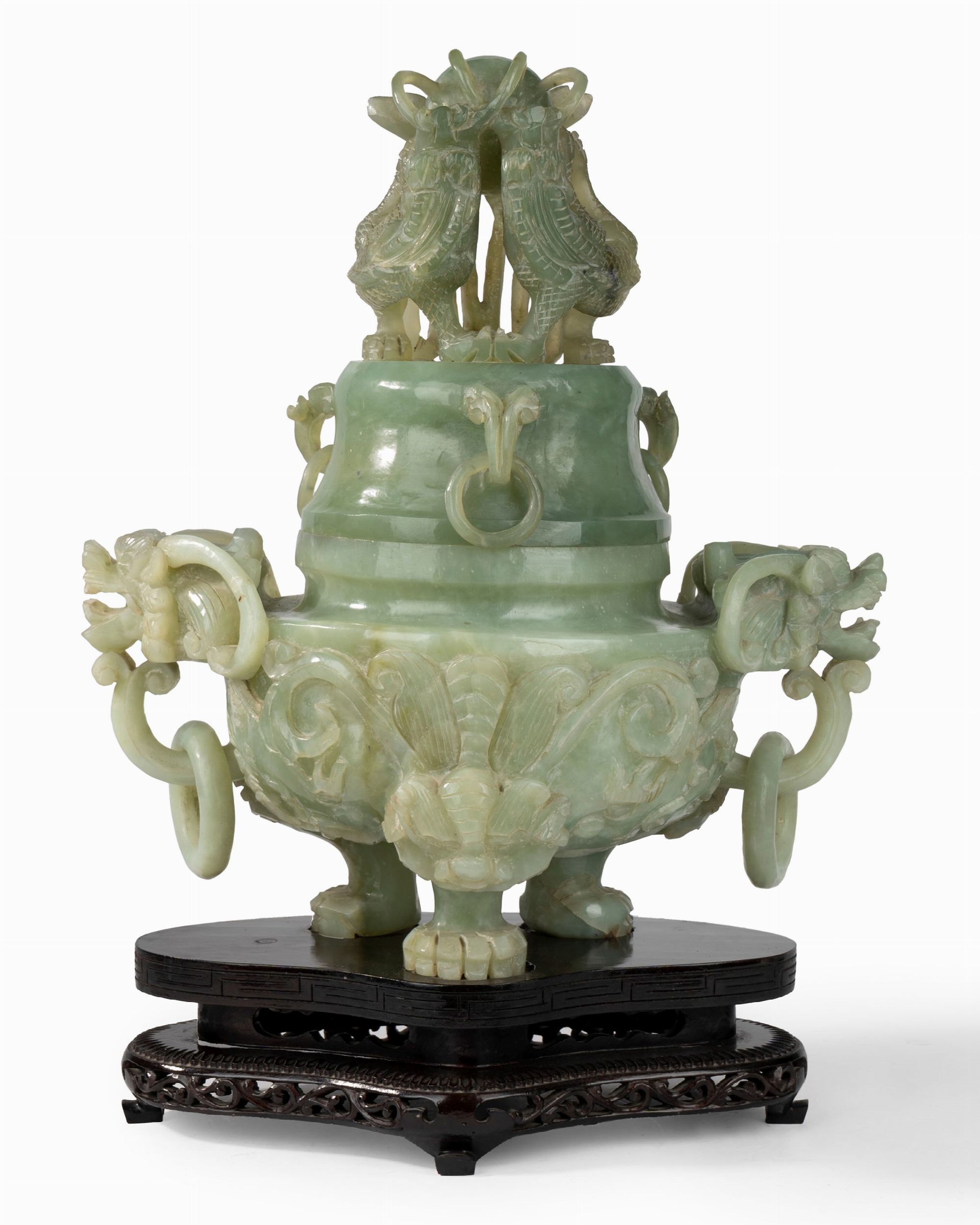 Tripode con mascheroni e anelli in pietra verde su base in legno modanata, Cina [..]
