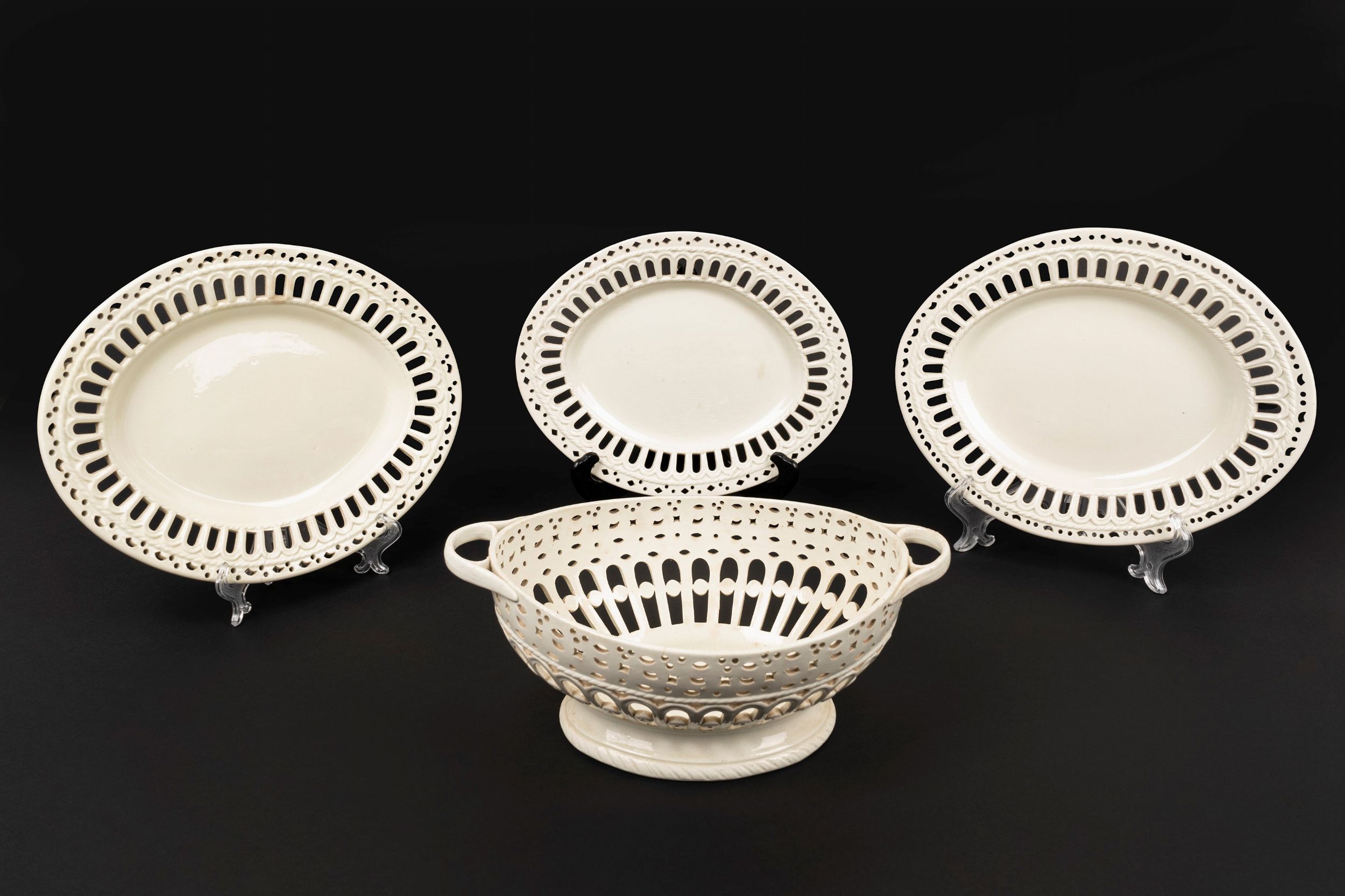 Un centrotavola e tre piatti ovali in terraglia bianca, Napoli,inizi secolo XIX