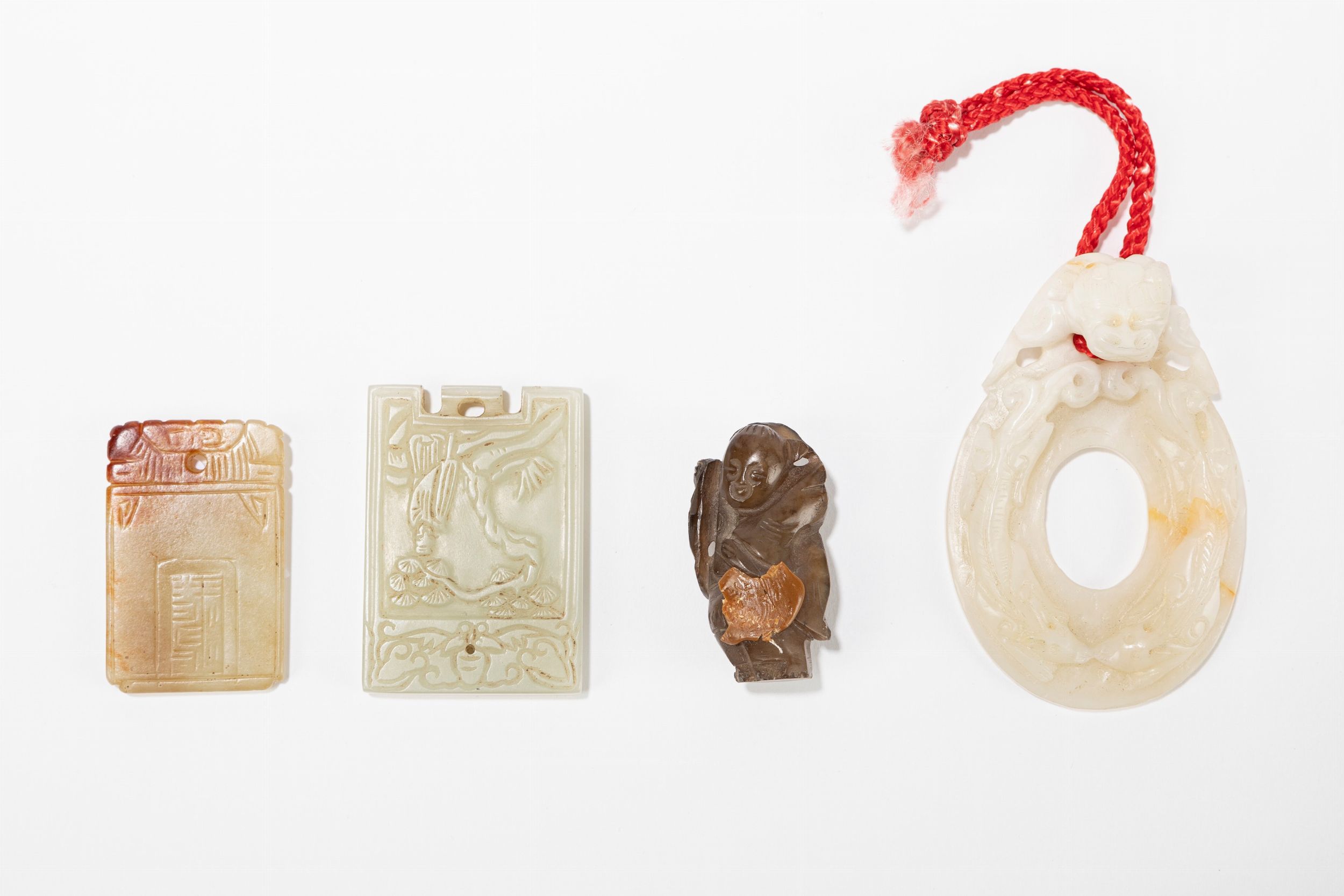 UN DISCO BI, DUE PENDENTI E UNA SCULTURINA IN PIETRA DURA/GIADA