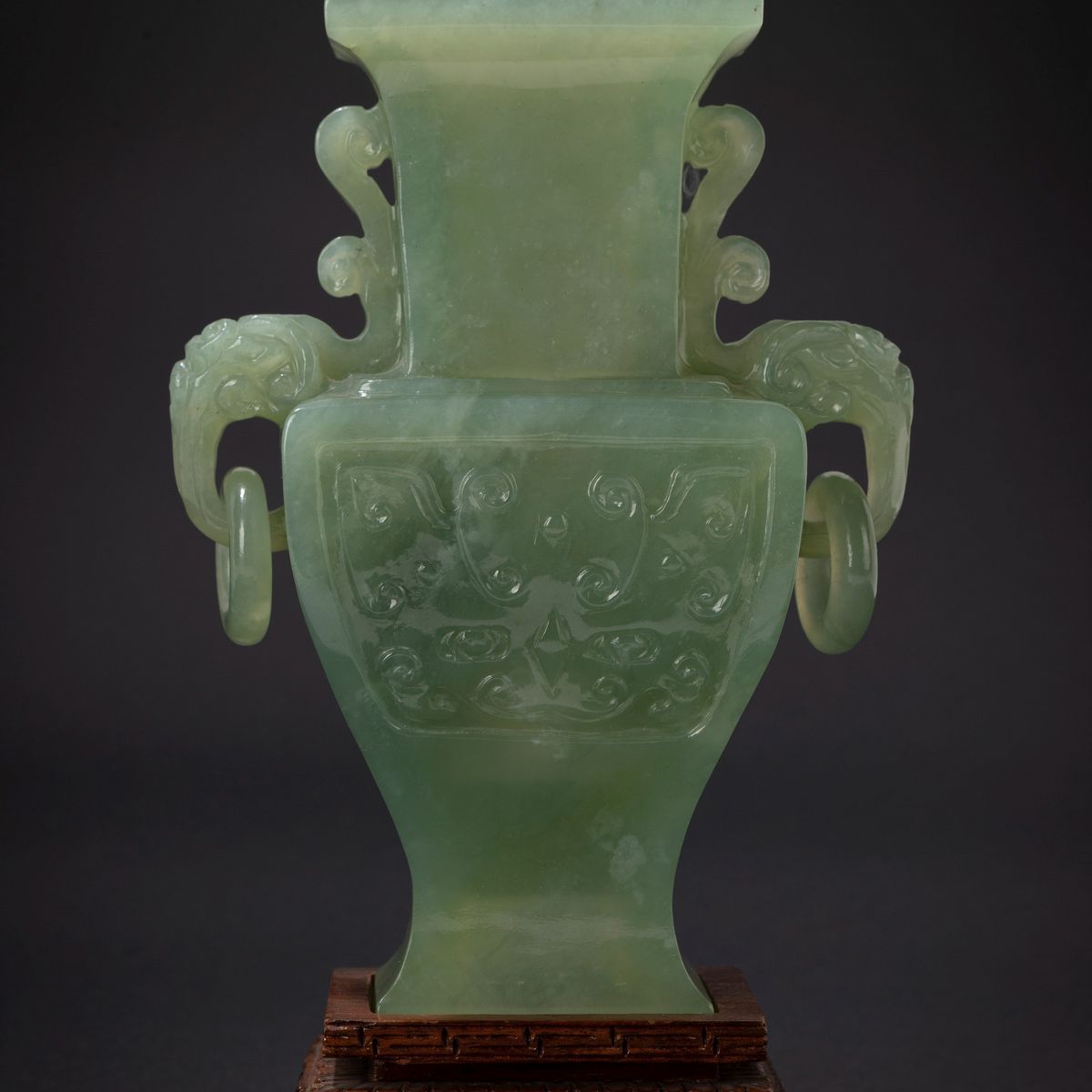 anse a guisa di elefanti con anelli (base in legno) 绿玉仿古造型花瓶(木底座)。 中国,20 世纪
