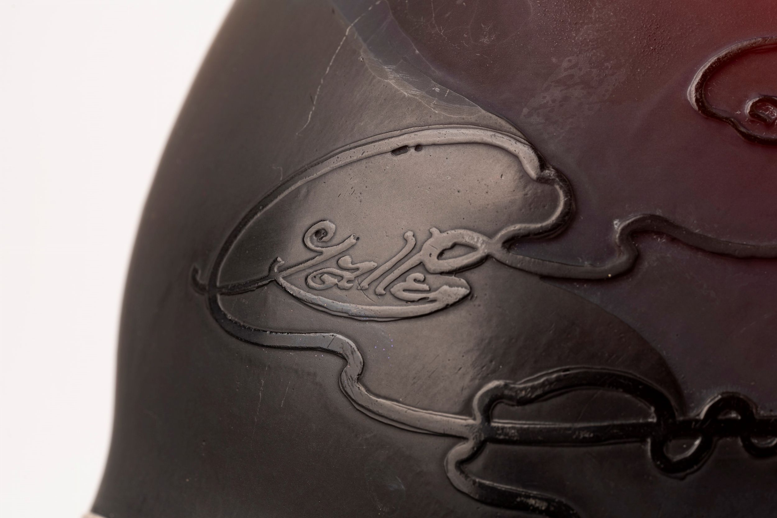 cm 33,5 x 16,5 x 11 lavorato all'acido con decori a tralci di vite e uva, collo e base in argento collo sbalzato e cesellato con motivi vegetali bollo testa di Minerva, Francia (sia sul collo che sulla base) firmato in basso Gallè