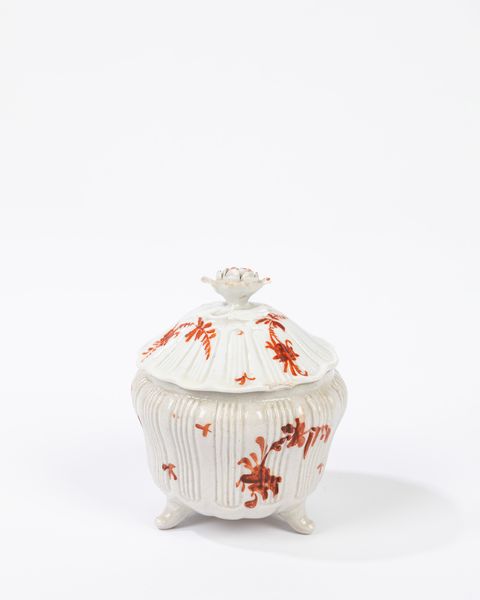 Manifattura Antonibon, Nove, circa 1770 di forma mossa, bombata e scanalata, poggiante su tre piedini, decoro a fiori sparsi, presa a rosa con foglia (mancanze al coperchio)