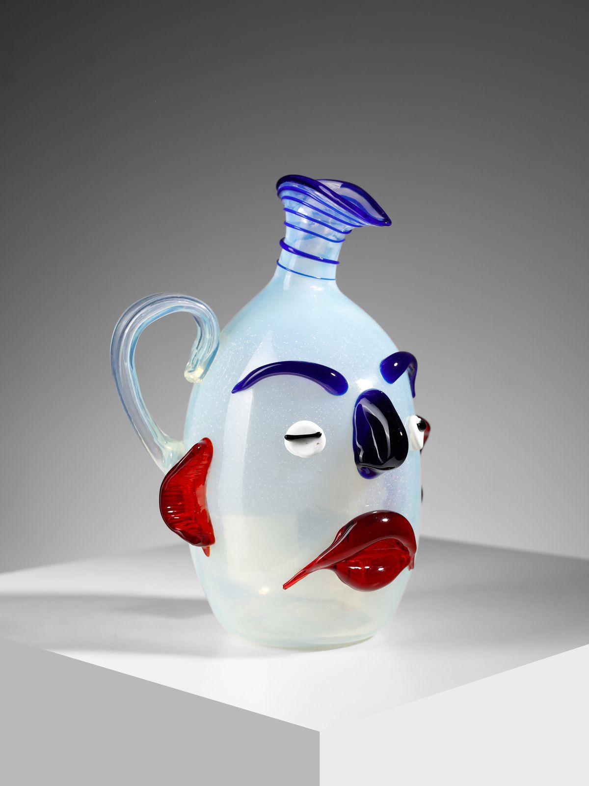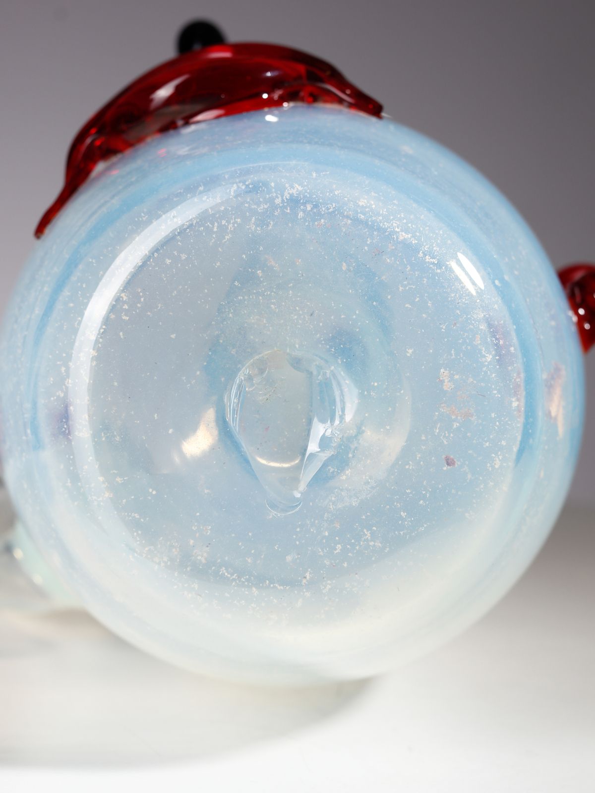 MANIFATTURA MURANESE Anfora con volto . Vetro lattescente con applicazioni in vetro trasparente blu e rosso e pasta vitrea lattimo.. Cm 25x20x15. Seconda metà del secolo XX.