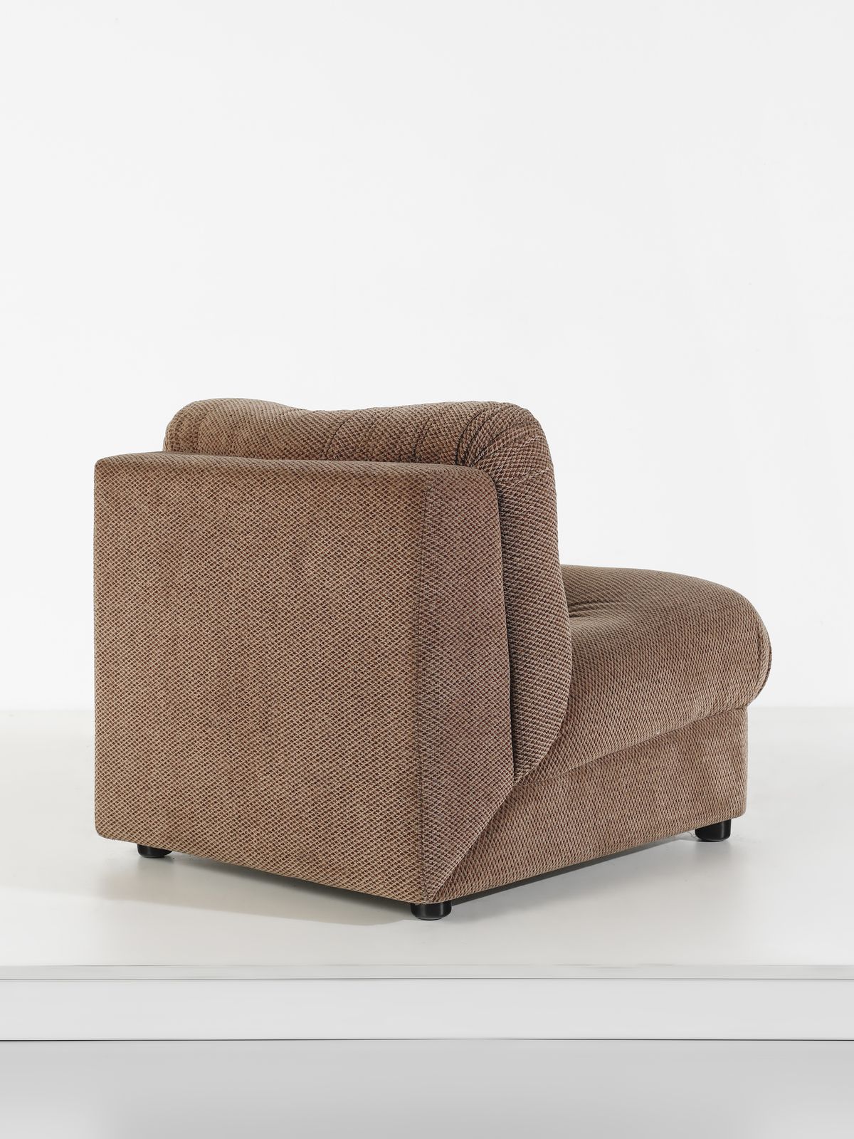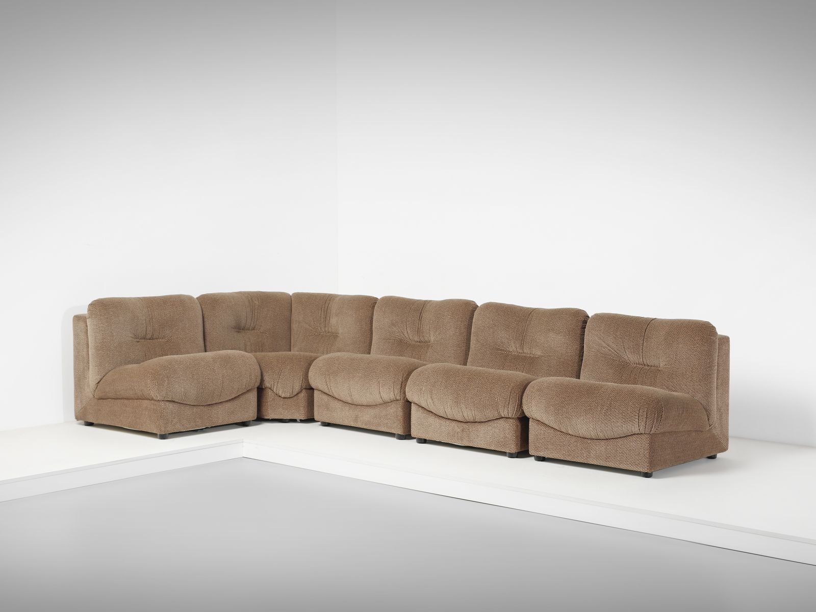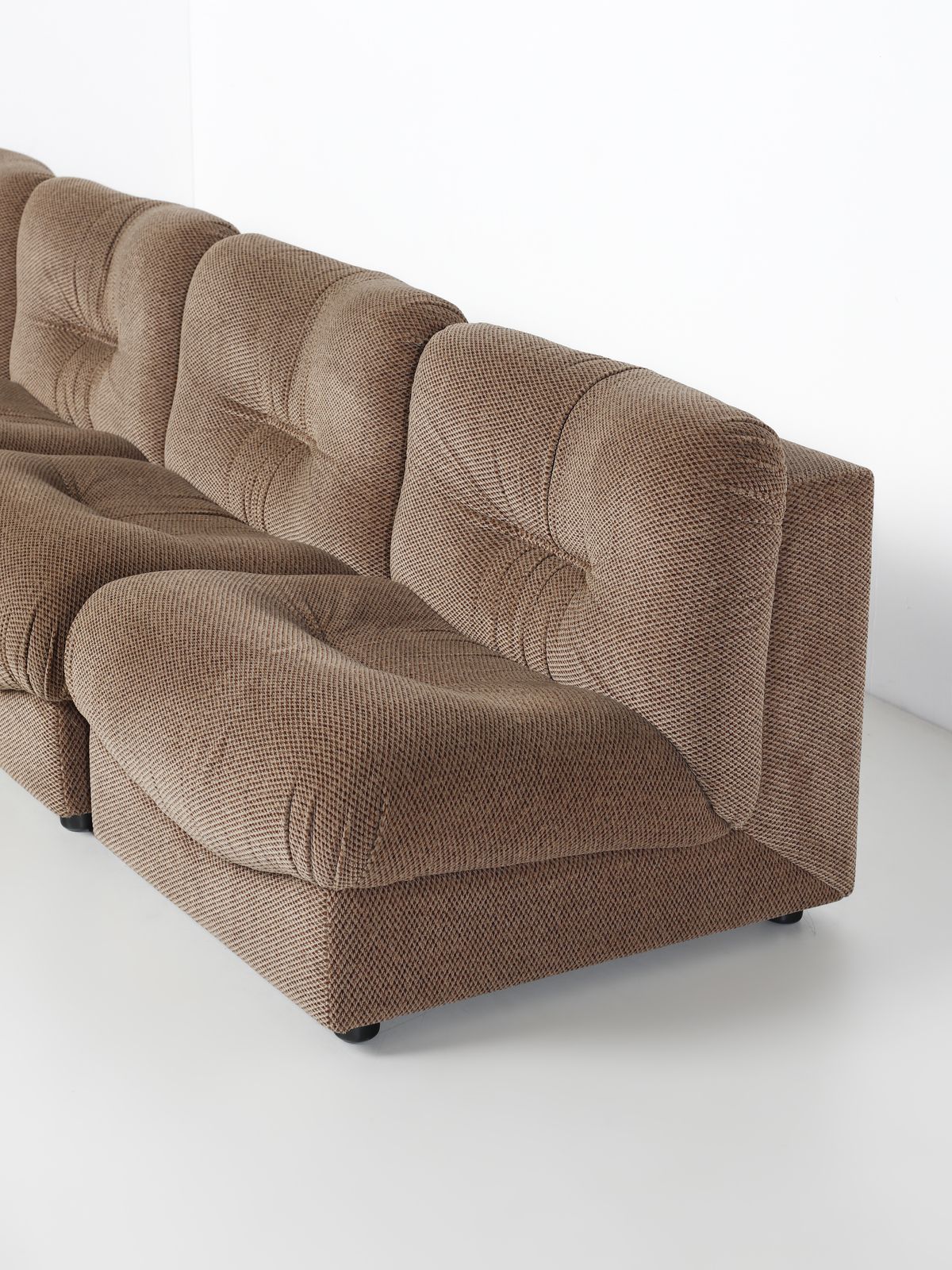 TECNOSALOTTO attribuito. Divano modulare (5 moduli). Legno, tessuto imbottito e plastica.. . Anni Settanta.Dimensioni: modulo angolare 74 x 100 x 100 cm. modulo singolo 74 x 80 x 85 cm
