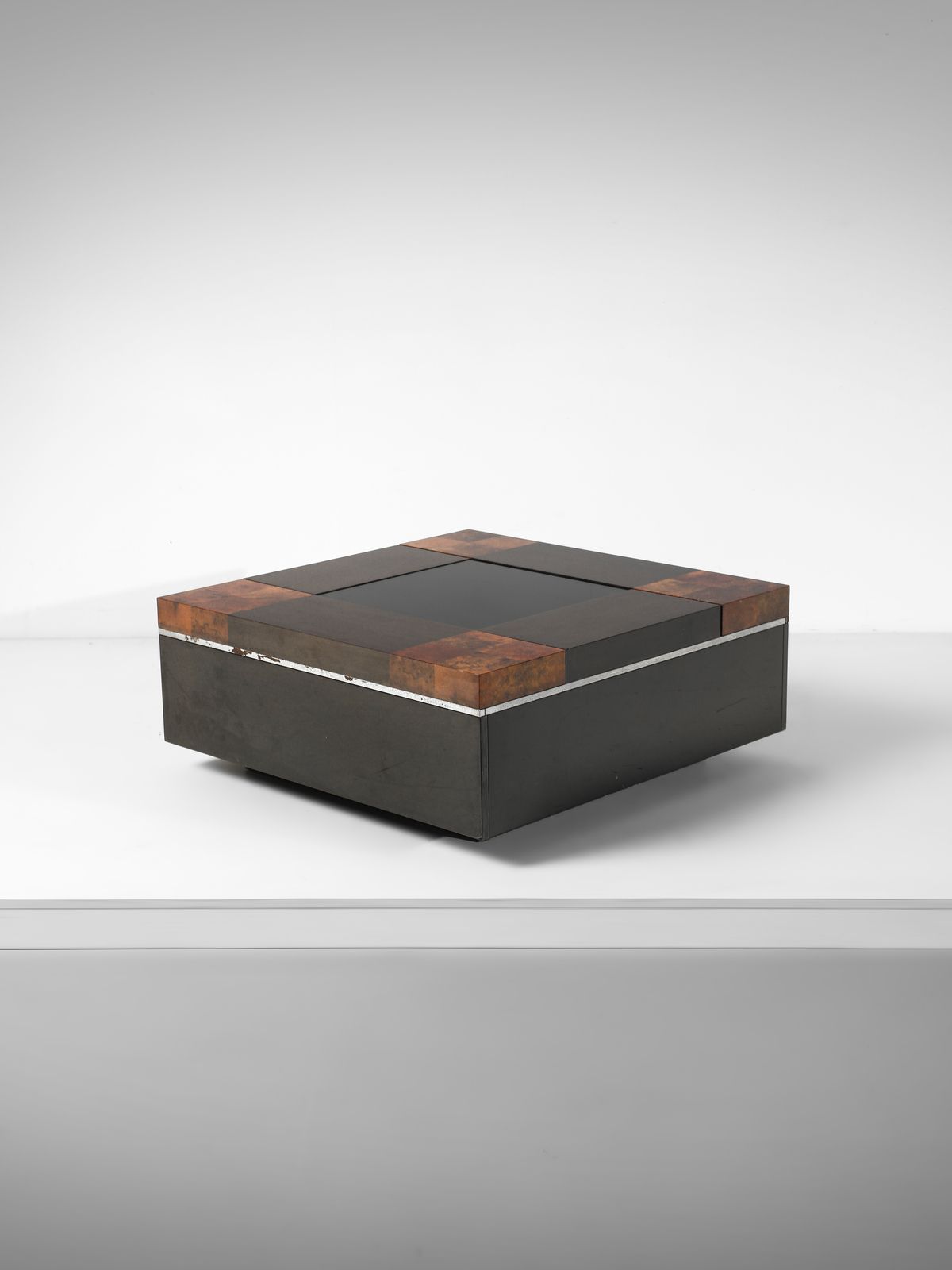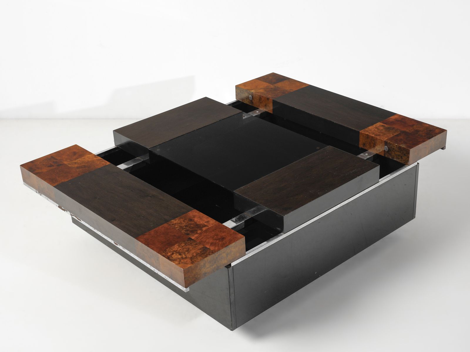 RIZZO WILLY (1928 - 2013) attribuito. Tavolino da salotto. Legno, radica e vetro.. Cm 41x100x100. Anni Settanta.