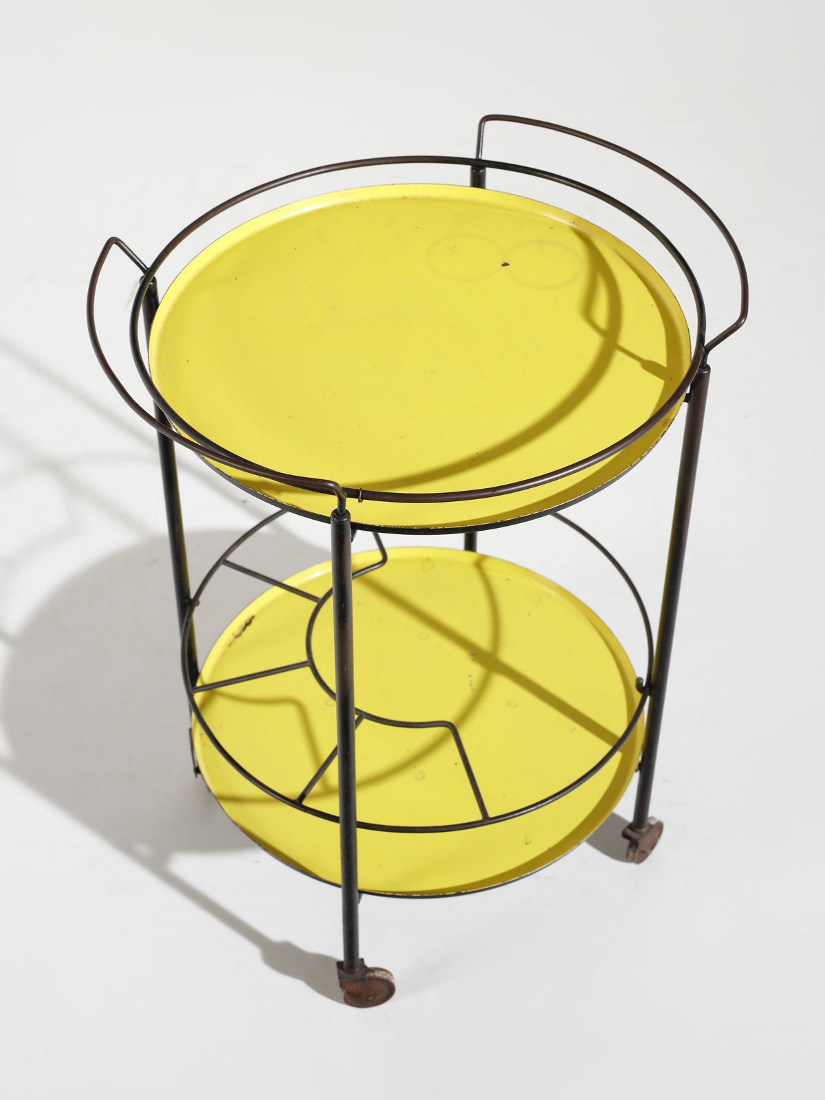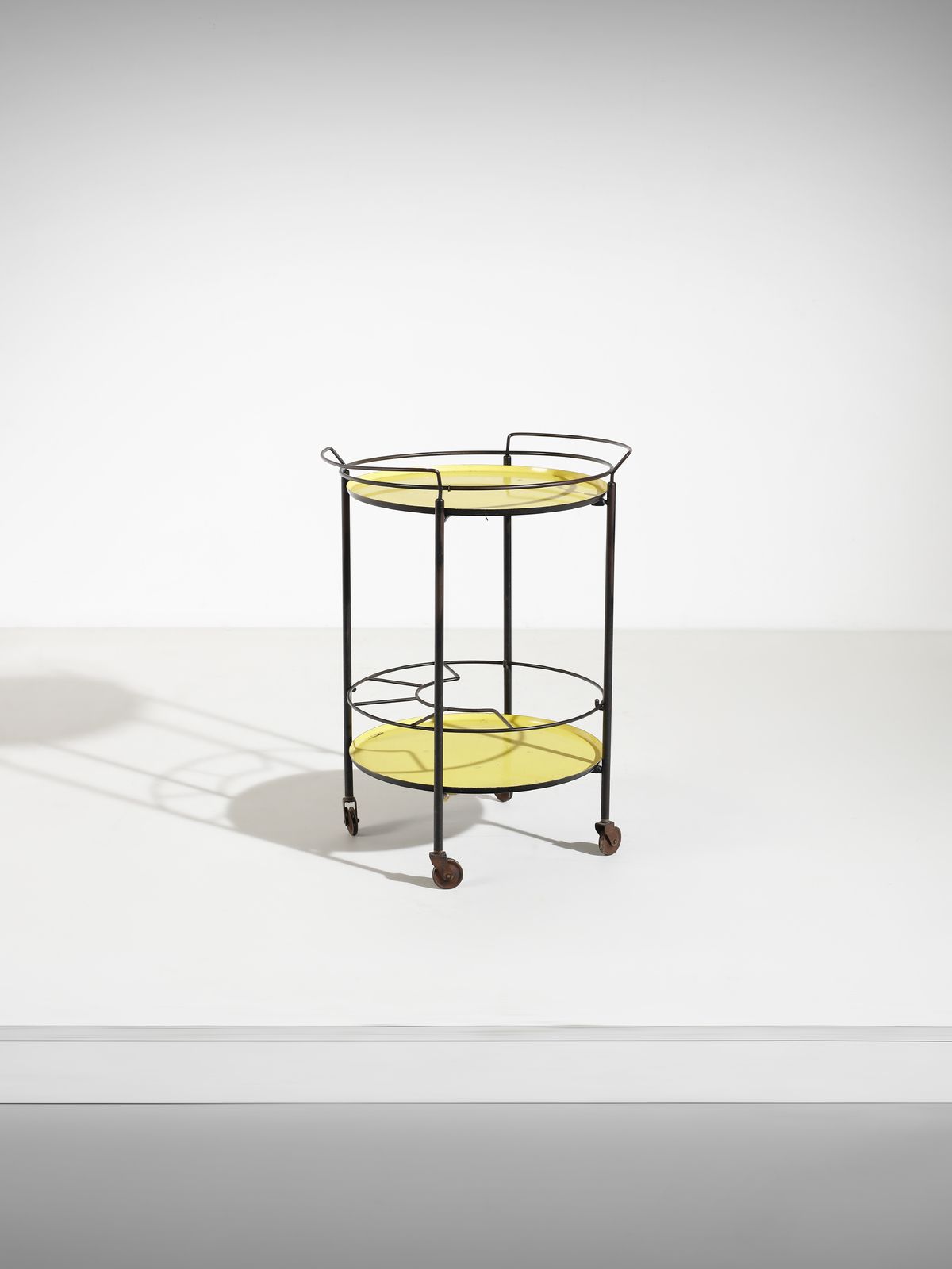 MANIFATTURA ITALIANA Carrello portavivande con portabottiglie e vassoi rimovibili. Ferro verniciato.. Cm 59x45x40. Anni Sessanta.