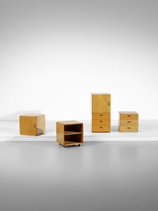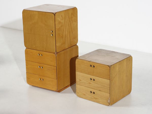 DE VRIES DERK JAN (1917 - 1991) Cinque contenitori/cassettiere. Legno.. . Anni Settanta.Dimensioni: 43 x 38 x 38 cm. 38 x 38 x 38 cm. 40 x 38 x 38 cm