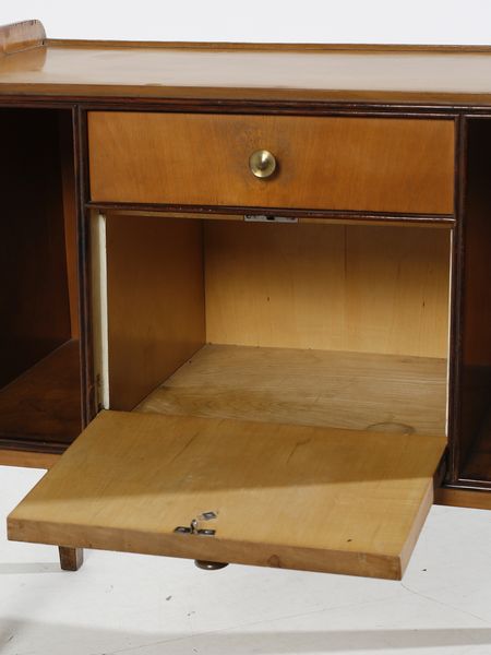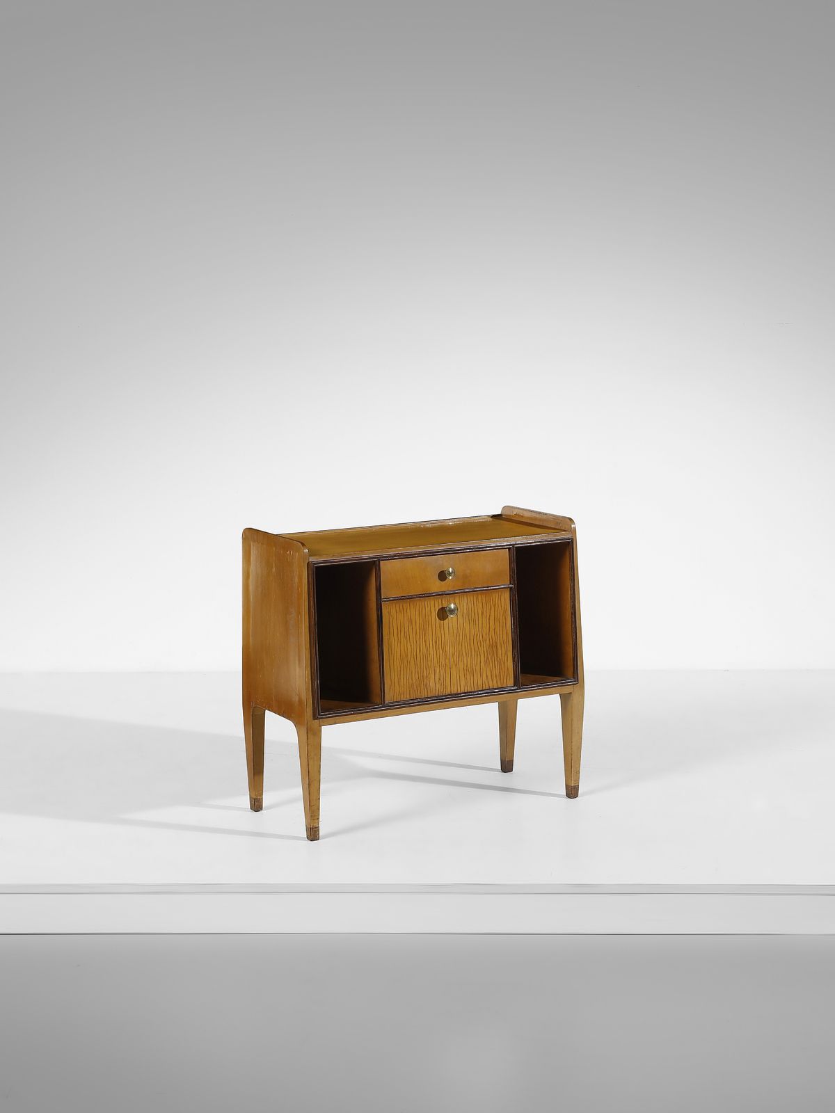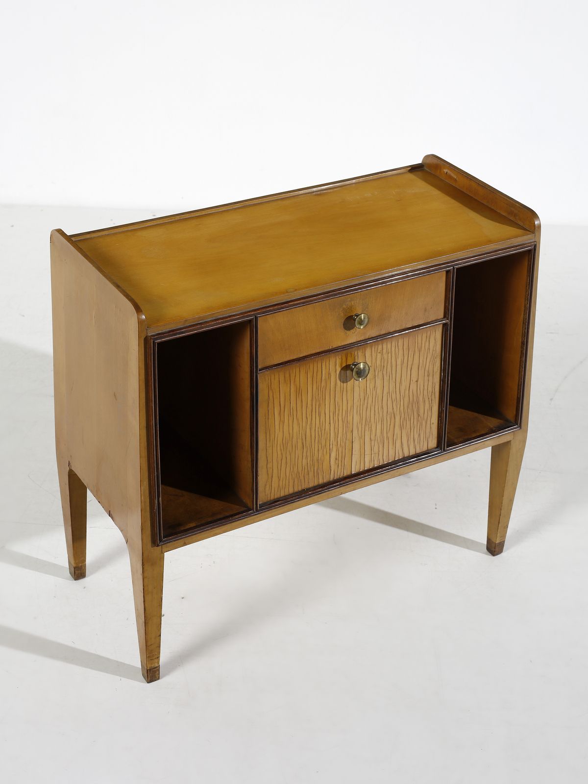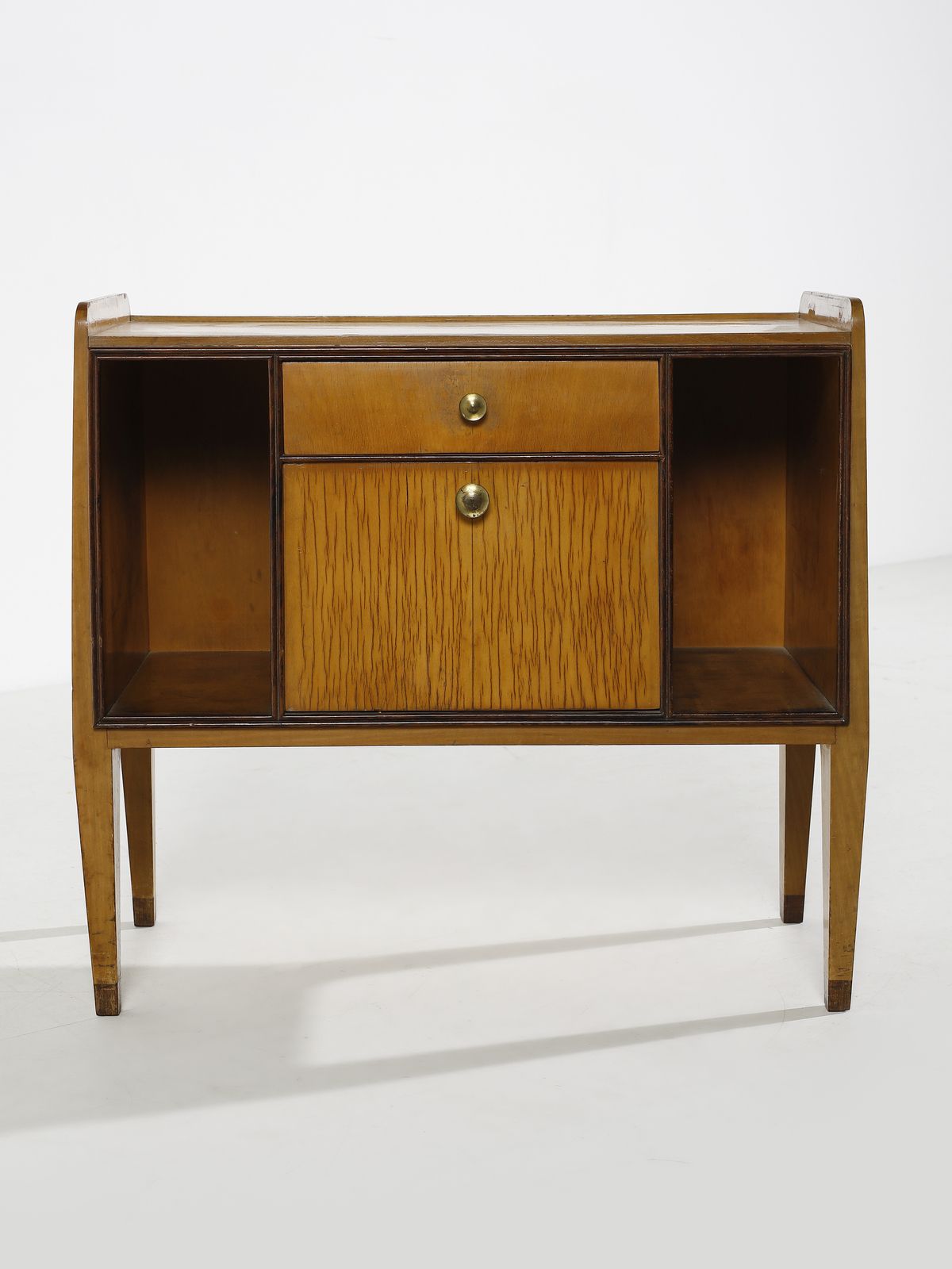 BUFFA PAOLO (1903 - 1970) Comodino con cassettino, ribalta e scomparti laterali, esecuzione Serafino Arrighi, Cantù. Legni in varie essenze e ottone.. Cm 63x67x31. 1952-1955.Lotto accompagnato dal certificato di autenticità rilasciato dall'Archivio Paolo Buffa, Cantù.
