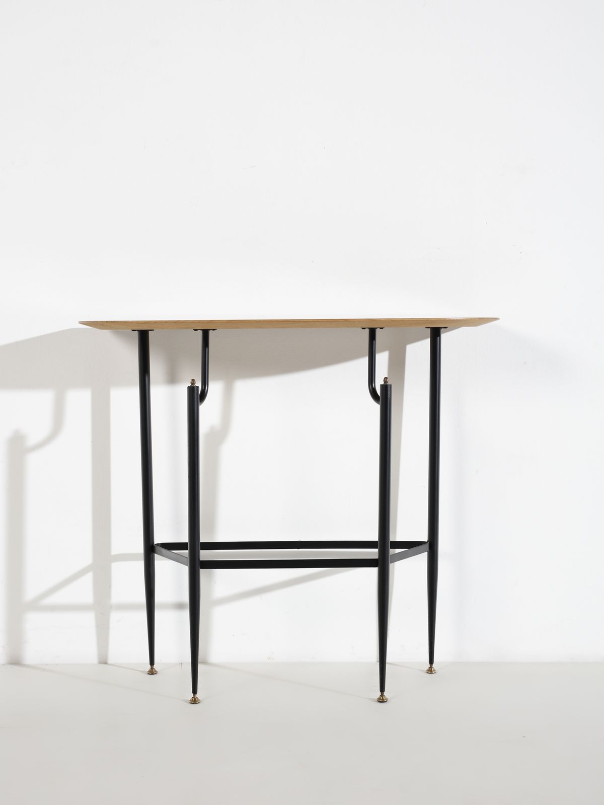 MANIFATTURA ITALIANA Consolle. Legno, metallo verniciato e ottone.. Cm 80x90x35. Anni Cinquanta.