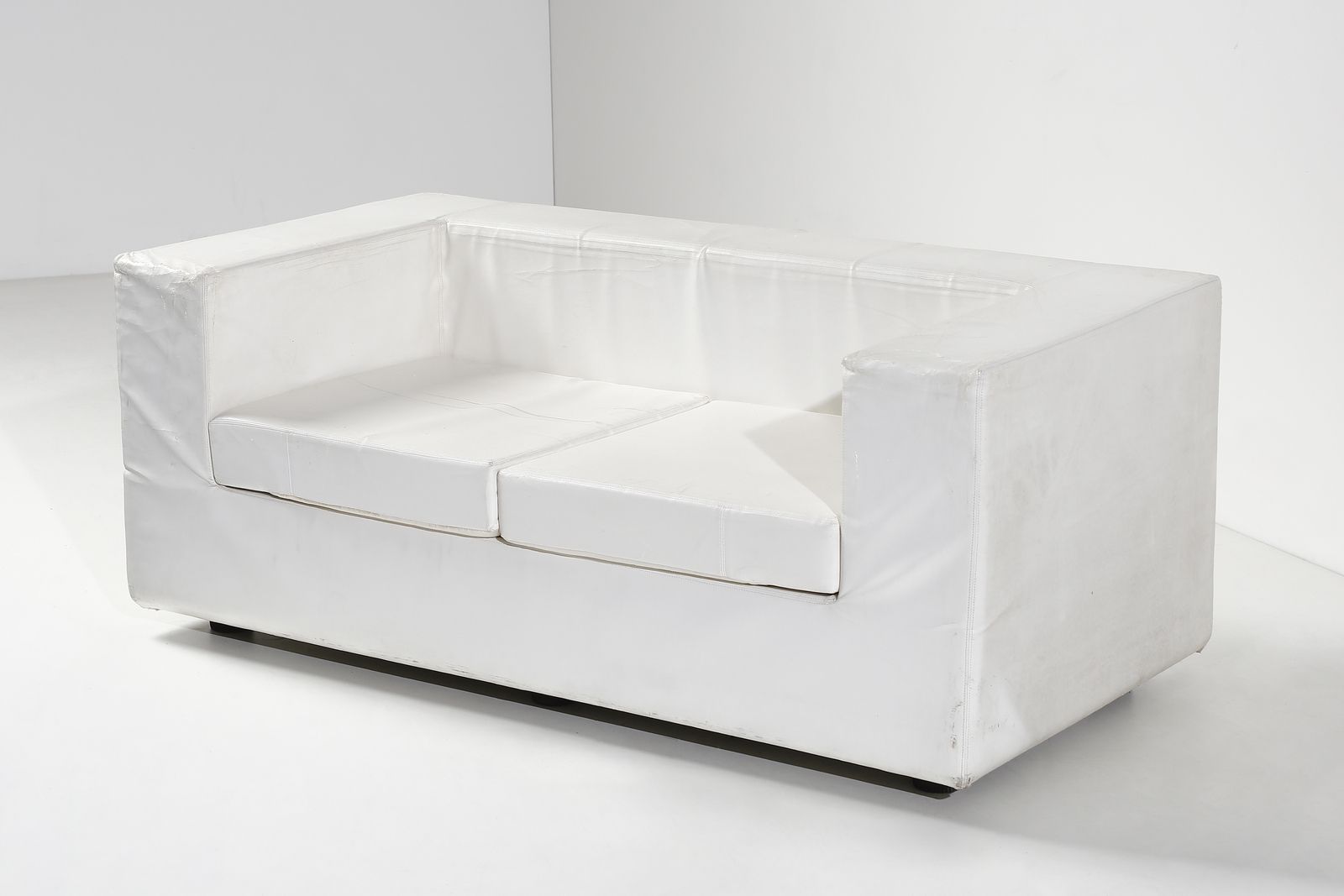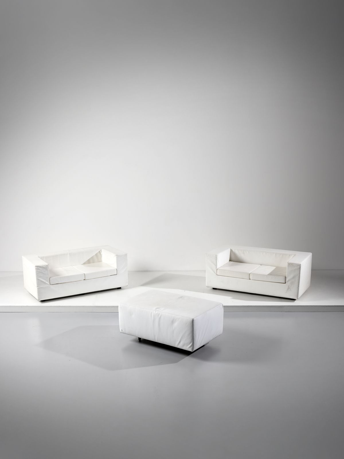 LANDELS WILLIE (n. 1928) Coppia di divani a due posti mod. Throw Away e pouf su ruote per Zanotta, Nova Milanese. 1965. Similpelle imbottita.. . Etichetta e marchio della produzione.Dimensioni: divano 60 x 150 x 75 cm. pouf 52 x 113 x 72 cmBibliografia: G. Gramigna, Repertorio del design italiano 1950-2000 per l'arredamento domestico, Allemandi, Torino 2003, p. 116