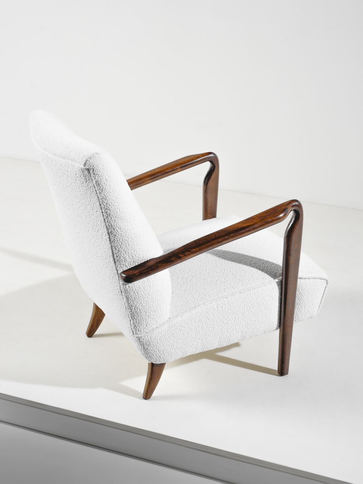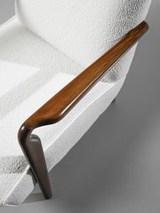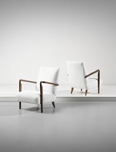 STUDIO TECNICO CASSINA Coppia di poltrone mod. 401, Meda. Legno e tessuto imbottito.. Cm 79x60x83. Fine anni Quaranta.