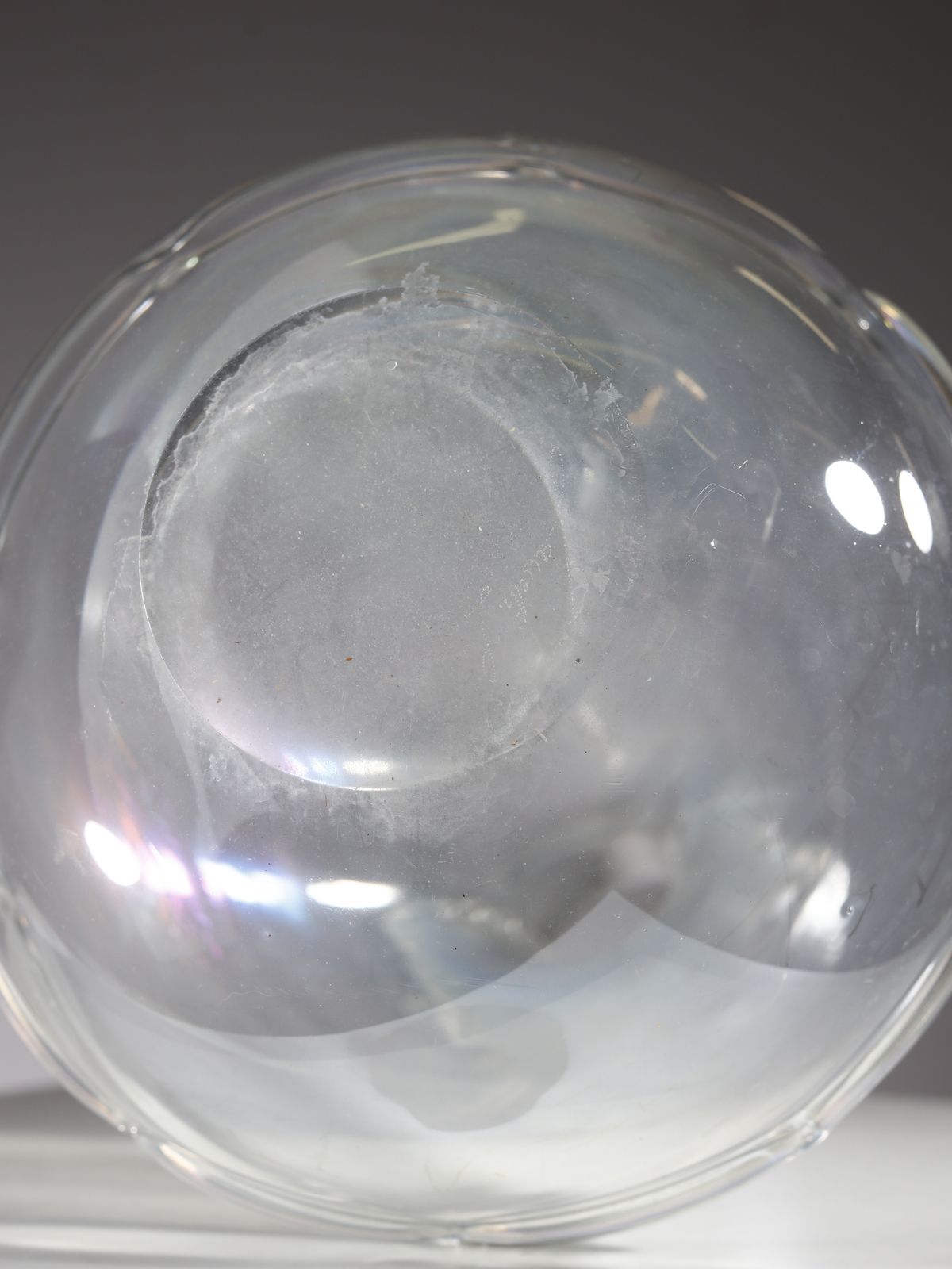 ZANETTI L. Grande vaso a collo allungato decorato con morise e fili di vetro orizzontali, Murano . Vetro cristallo iridato.. Cm 38x24x24. Anni Settanta.Firmato a punta sotto la base.