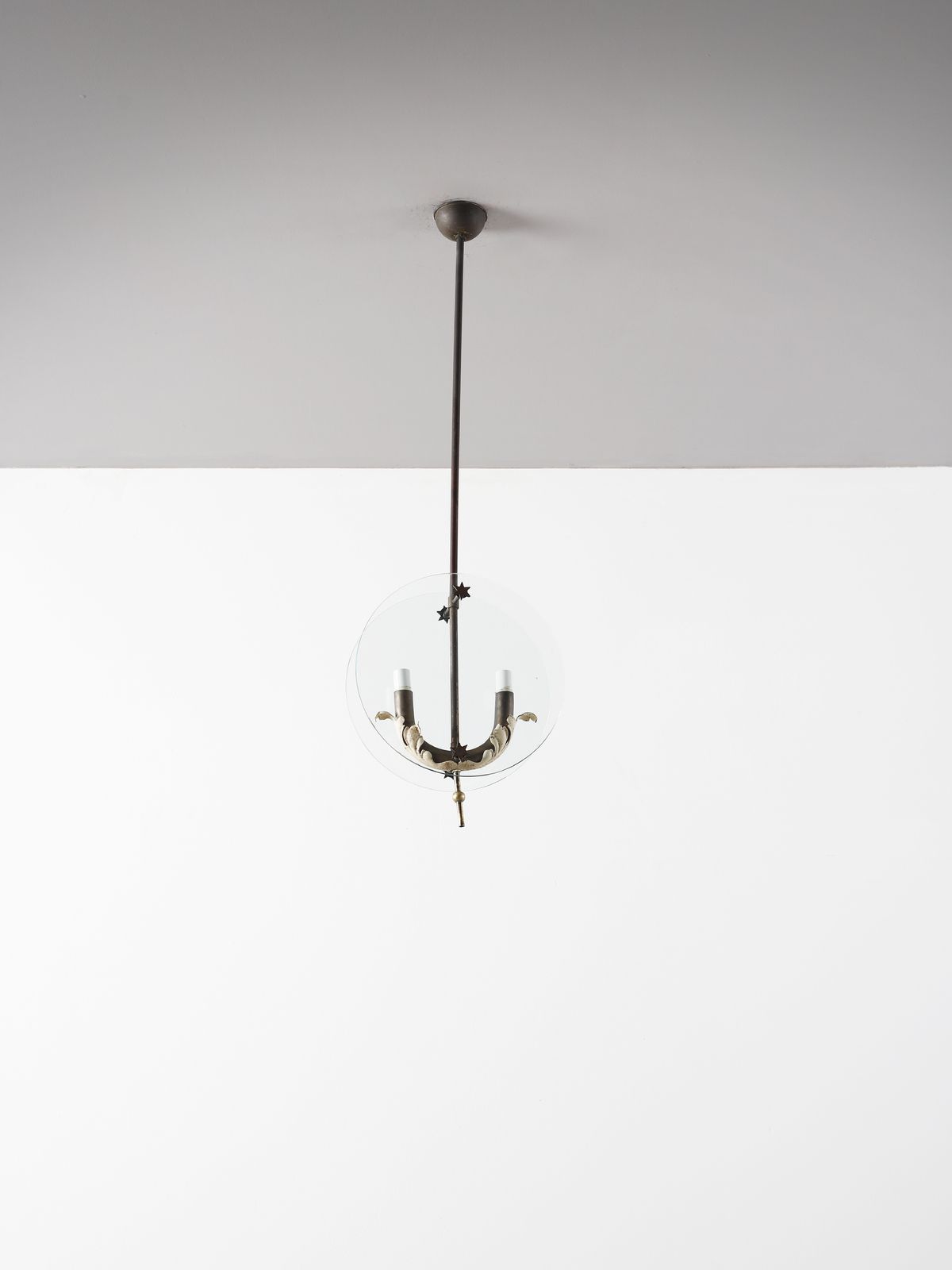 MANIFATTURA ITALIANA Lampada a sospensione. Vetro, ottone e alluminio verniciato. . Cm 110,50x33,50x11. Anni Trenta.