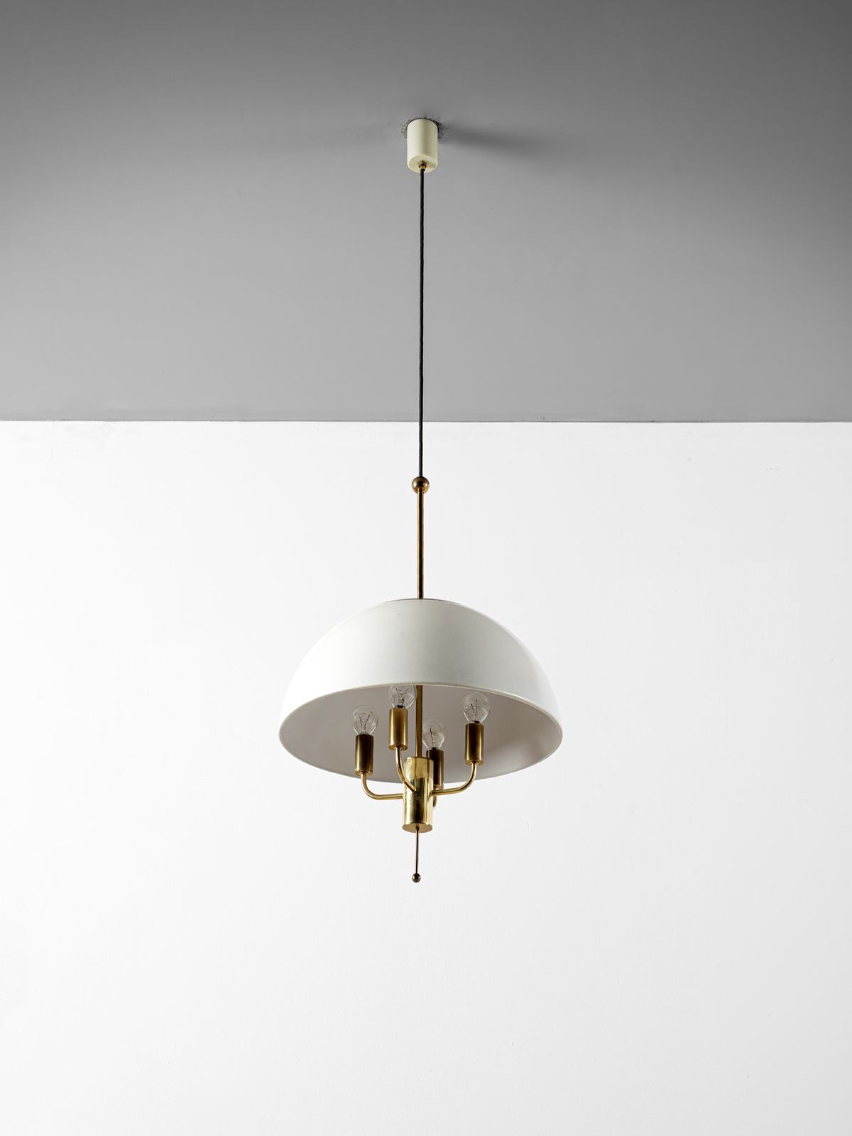MANIFATTURA ITALIANA Lampada a sospensione. Ottone e metallo verniciato.. Cm 68x43x43. Anni Sessanta.
