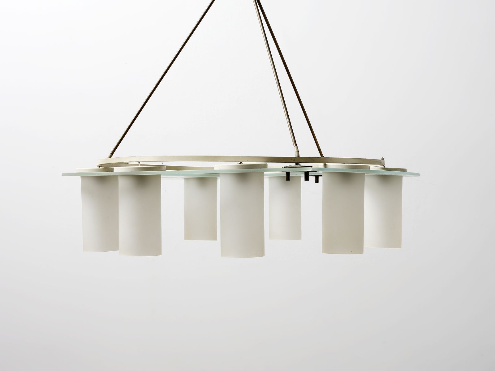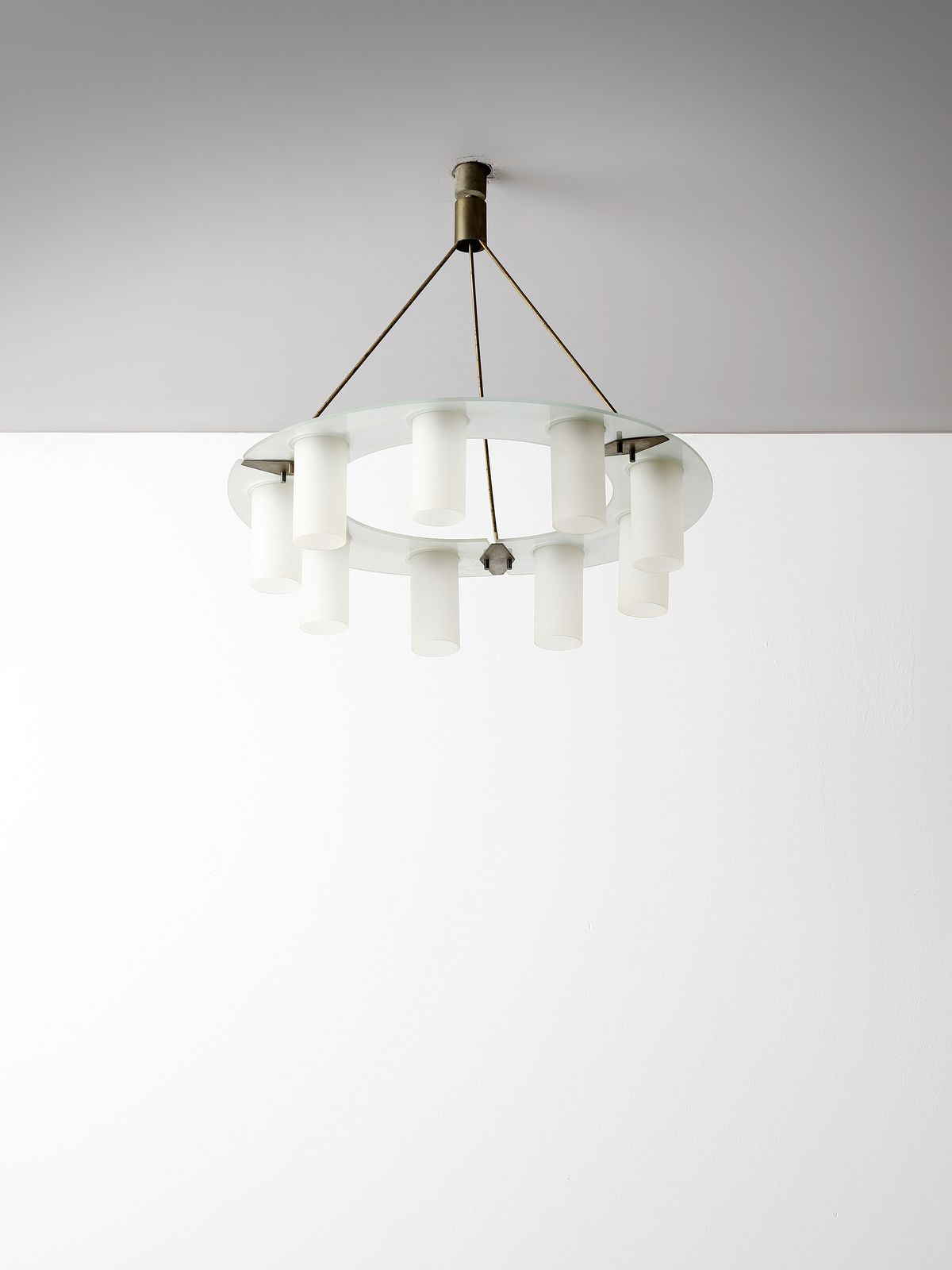 STILUX Lampada a sospensione a nove luci, Milano. Metallo verniciato, ottone e vetro satinato.. Cm 80x72x72. Anni Cinquanta.