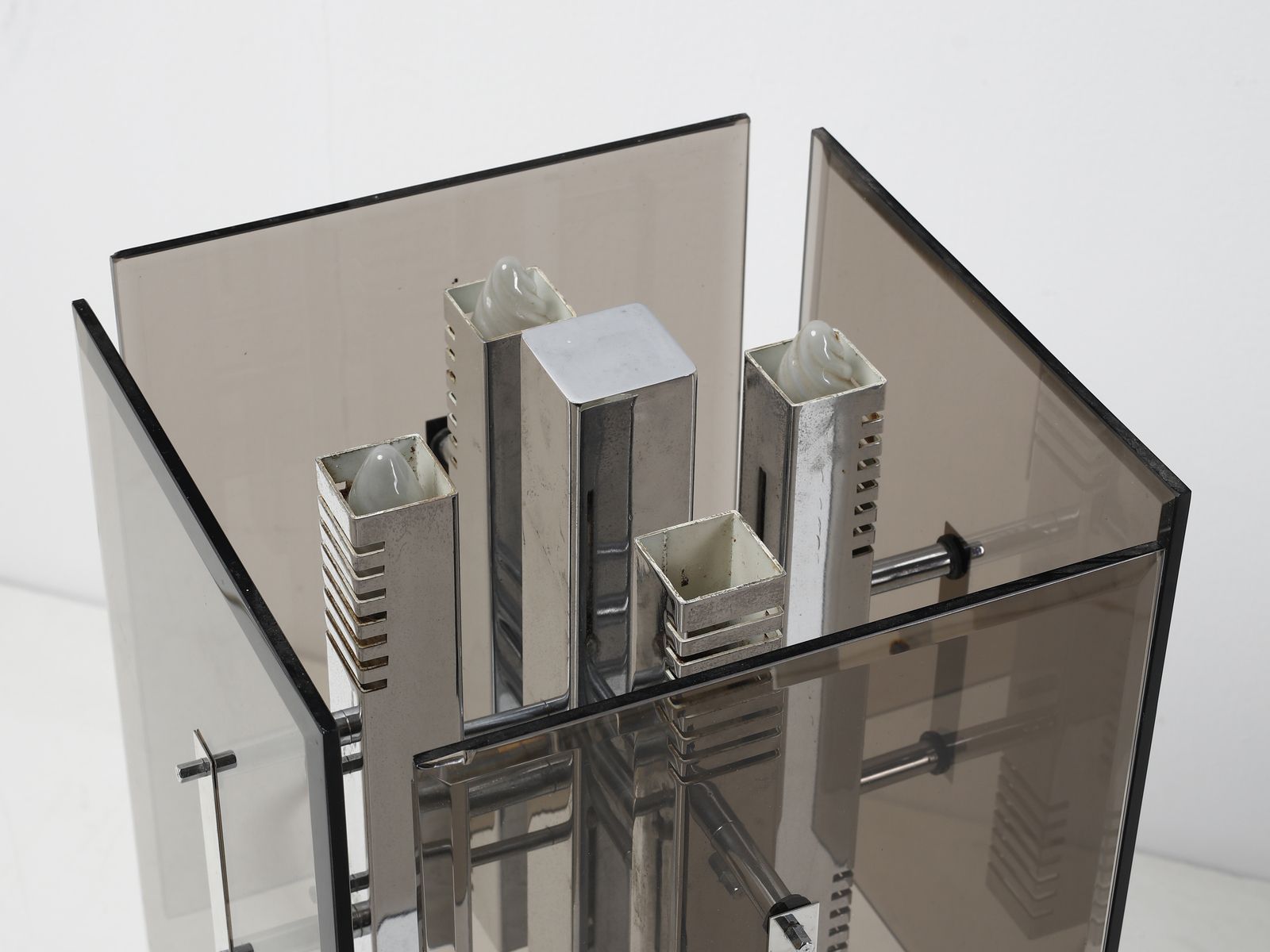 MANIFATTURA ITALIANA Lampada da tavolo. Acciaio e vetro. Cm 70x33x33. Anni Settanta.