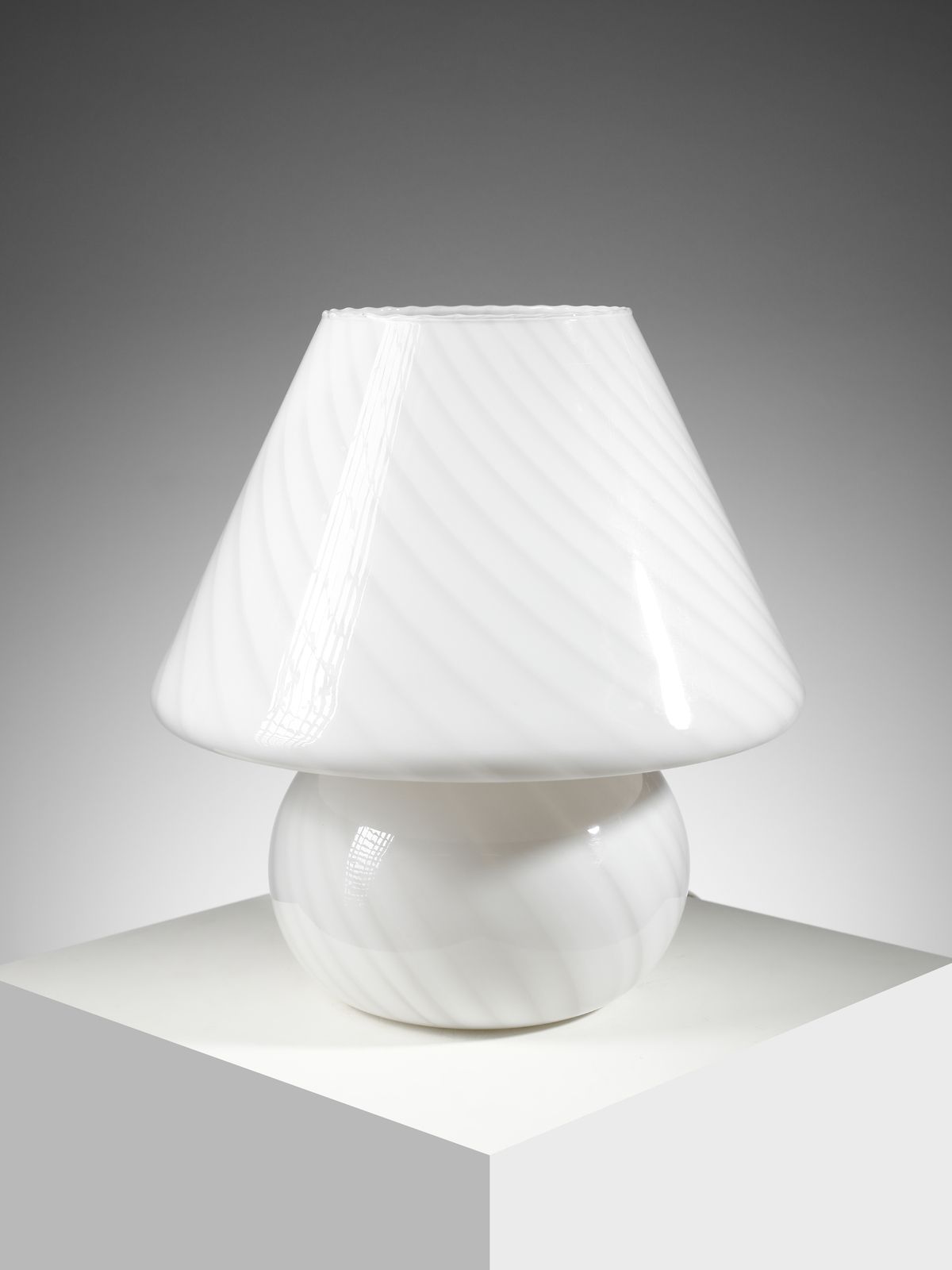 MANIFATTURA ITALIANA Lampada da tavolo. Vetro a fasce sfumate lattimo.. Cm 28x24x24. Anni Ottanta / Novanta.