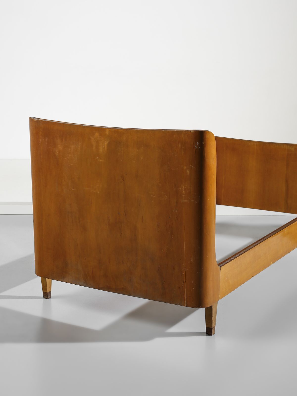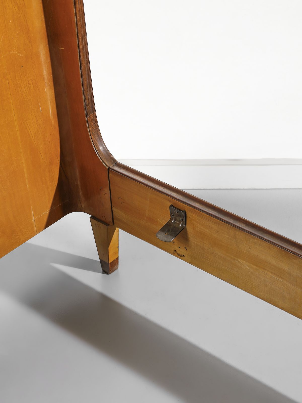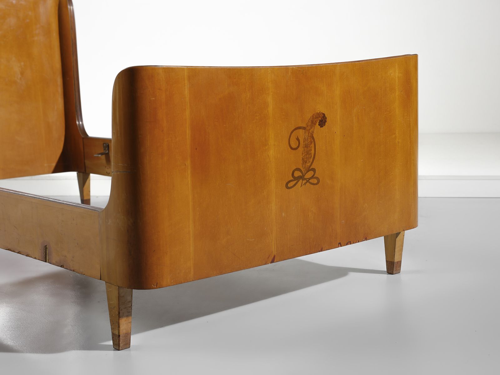 BUFFA PAOLO (1903 - 1970) Letto singolo con testata e pediera ricurve con decoro a tarsie a foglie d'acanto, esecuzione Serafino Arrighi, Cantù. Legni di varie essenze.. Cm 100x205x100. 1952-1955.Lotto accompagnato dal certificato di autenticità rilasciato dall'Archivio Paolo Buffa, Cantù.