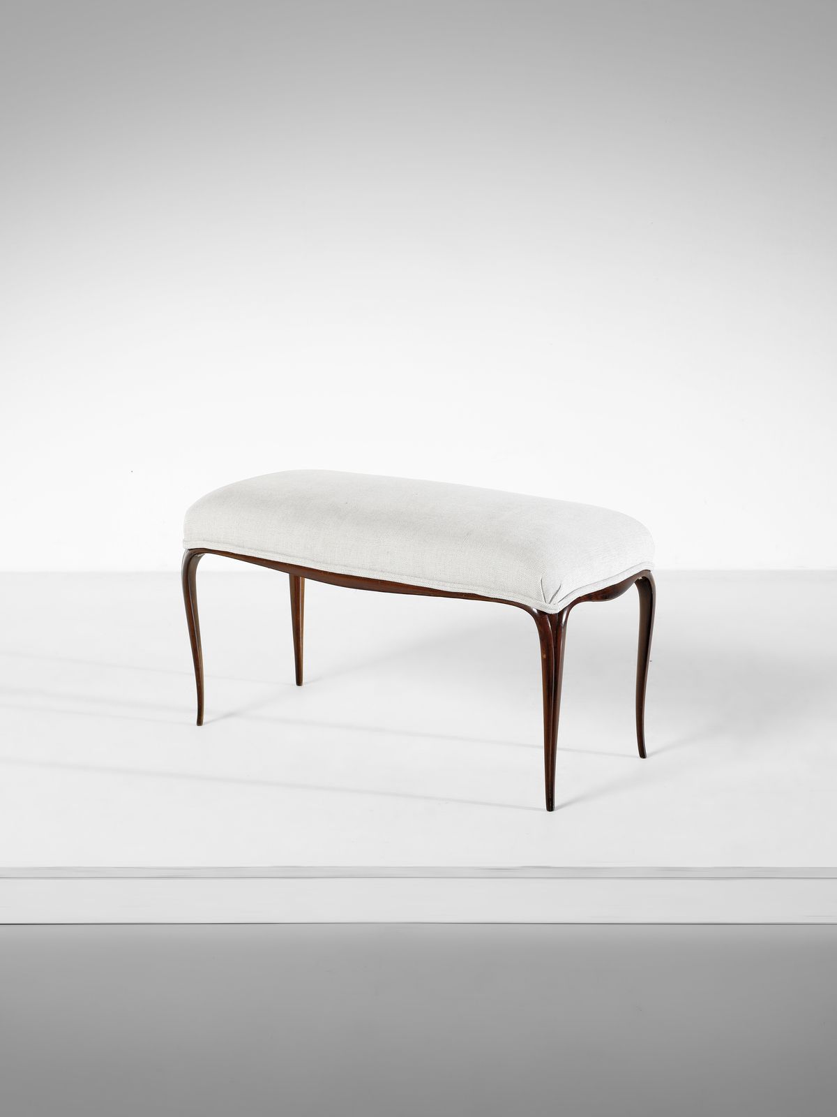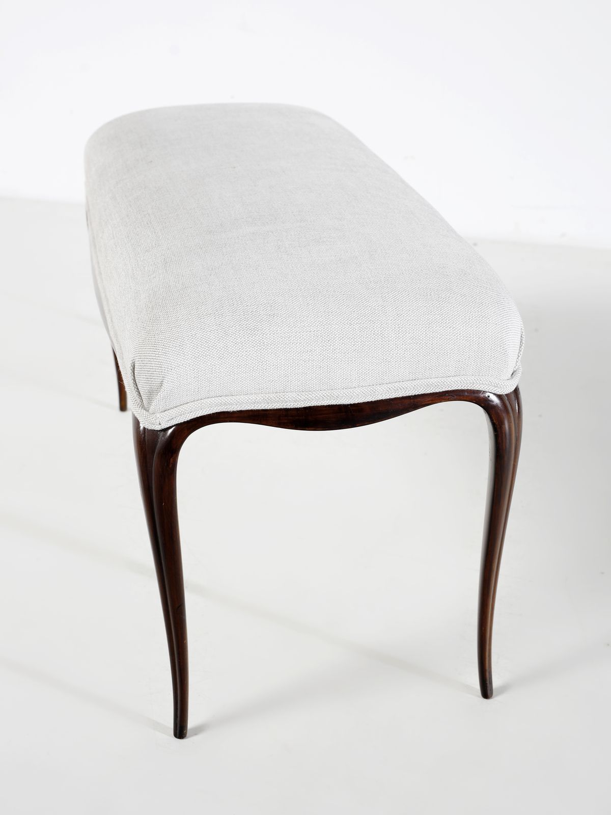 MANIFATTURA ITALIANA Panchetta. Legno e tessuto imbottito.. Cm 51x92x40. Anni Quaranta/Cinquanta.