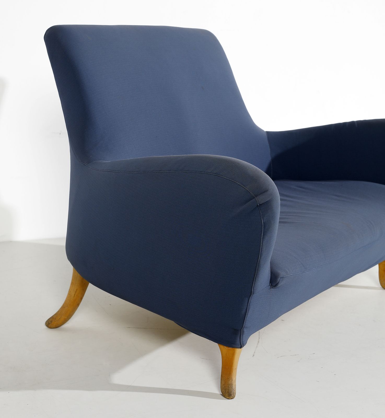 RASULO PROSPERO (n. 1953) Poltrona e divanetto mod. She per Poltronova, Firenze. 1992. Legno e tessuto imbottito.. . Etichetta della produzione.Dimensioni: divano 88 x 130 x 80 cm. poltrona 88 x 88 x 83 cm