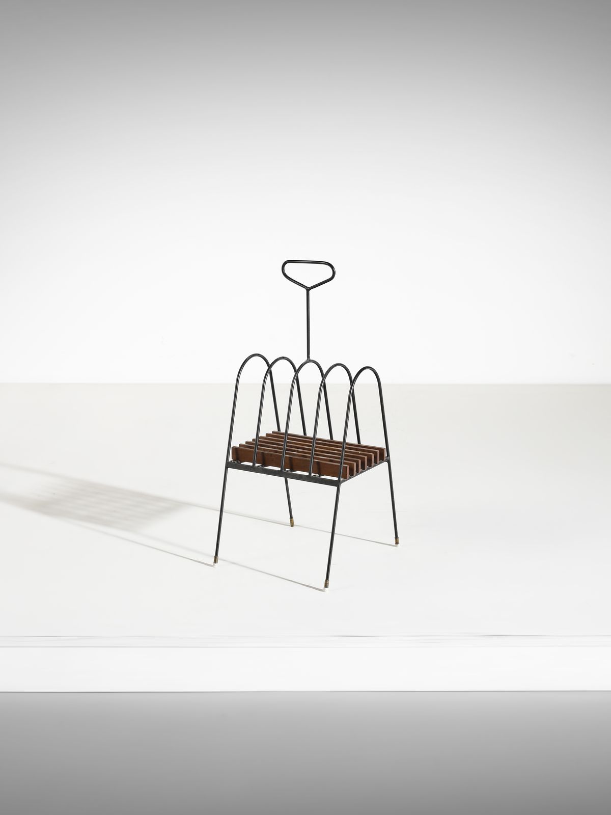 MANIFATTURA ITALIANA Portariviste. Ferro verniciato, ottone e legno.. Cm 60x30x26. Anni Cinquanta.