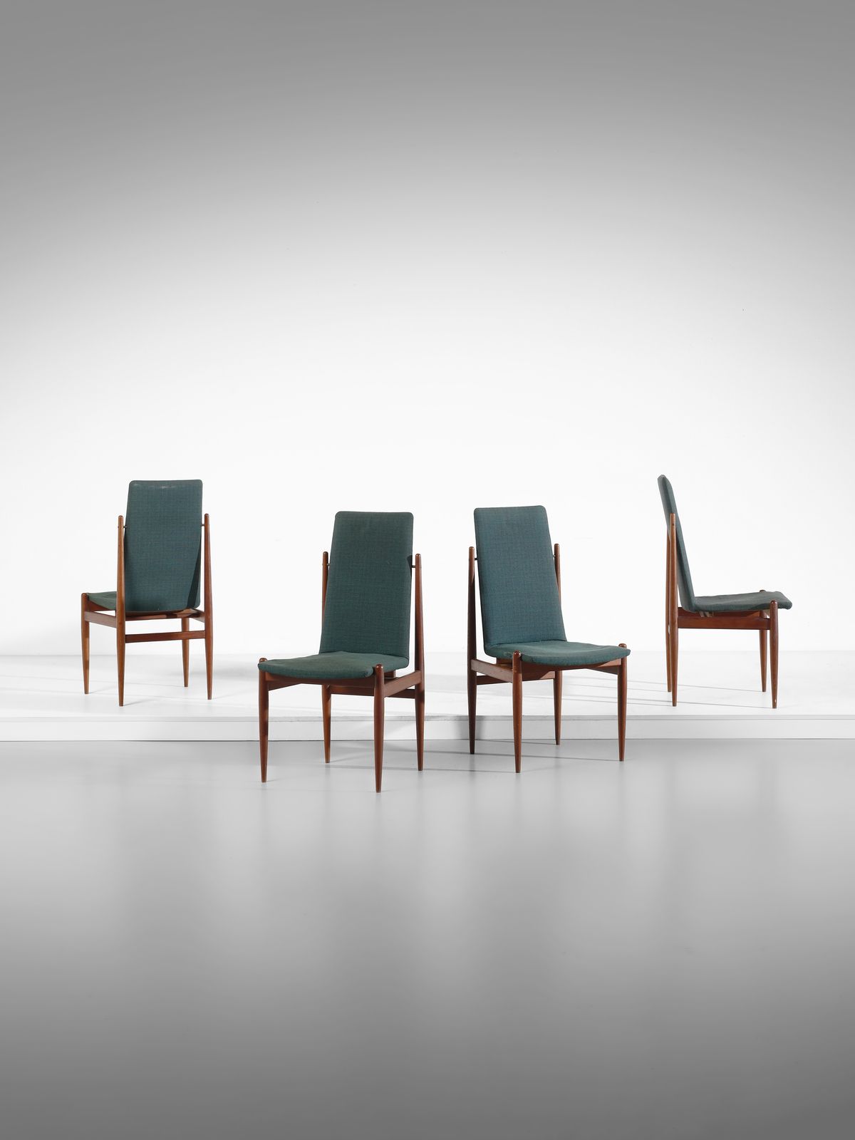 MANIFATTURA DANESE Quattro sedie. Legno di teak e tessuto imbottito.. Cm 98x51x51. Anni Sessanta.