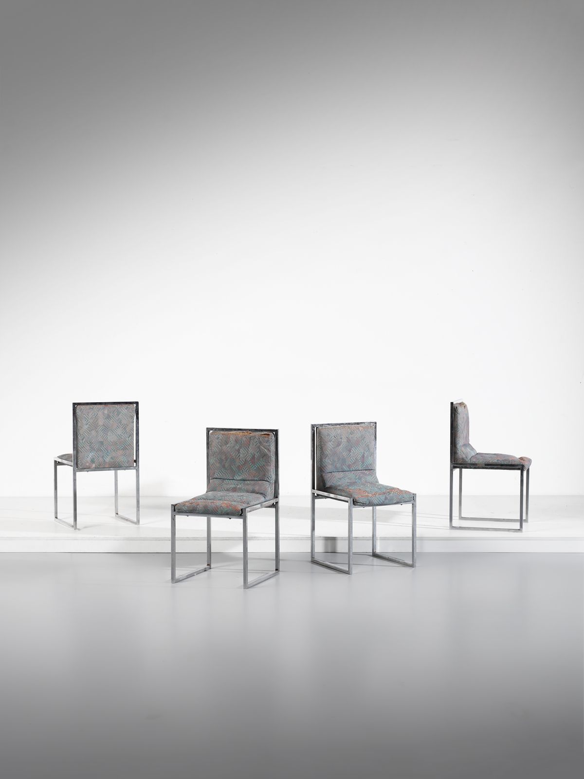 REGA ROMEO (1925 - 1984) Quattro sedie . Acciaio cromato e tessuto imbottito.. Cm 84,50x46x49. Anni Settanta.