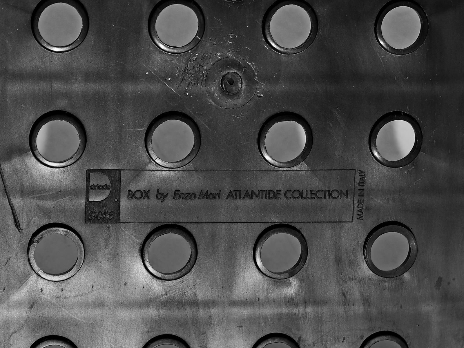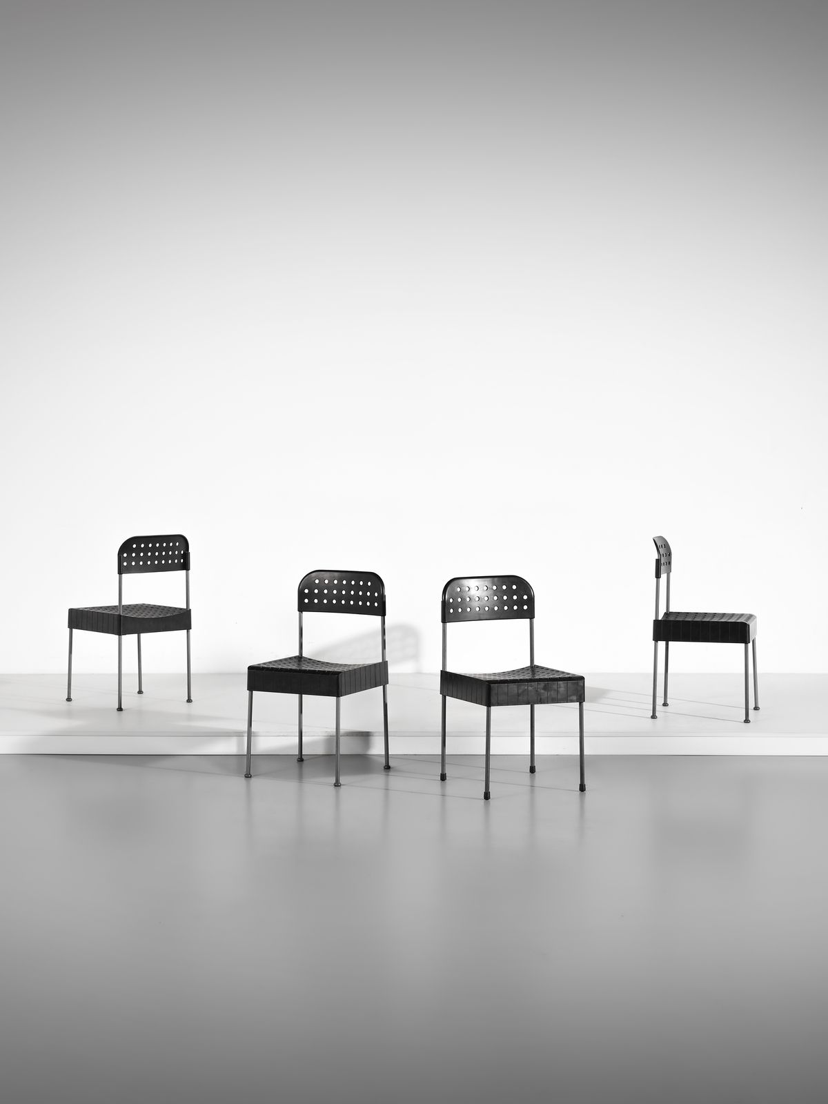 MARI ENZO (1932 - 2020) Quattro sedie della collezione Atlantide mod. Box per Driade, Italia. 1976. Tondino di ferro verniciato e plastica forata.. Cm 82x44,50x43. Marcate sotto la seduta.Bibliografia: G. Gramigna, Repertorio del design italiano 1950-2000 per l'arredamento domestico, Allemandi, Torino 2021, p. 239