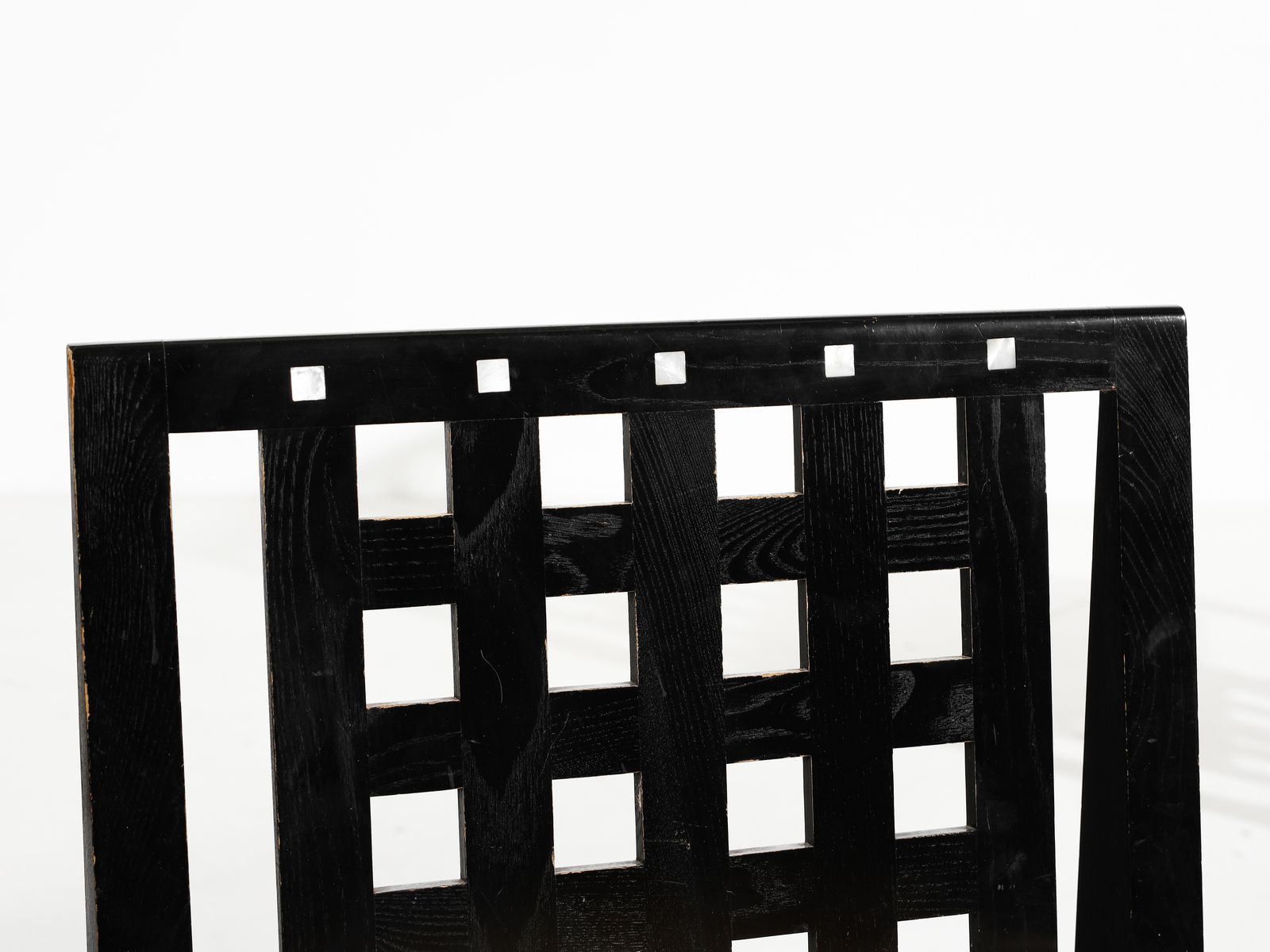 MANIFATTURA ITALIANA Quattro sedie ispirate al mod. 325 D.S.4 di Charles Rennie Mackintosh . Legno, corda e madreperla.. Cm 75x50x45. Anni Ottanta.