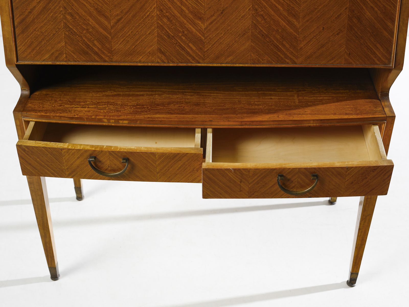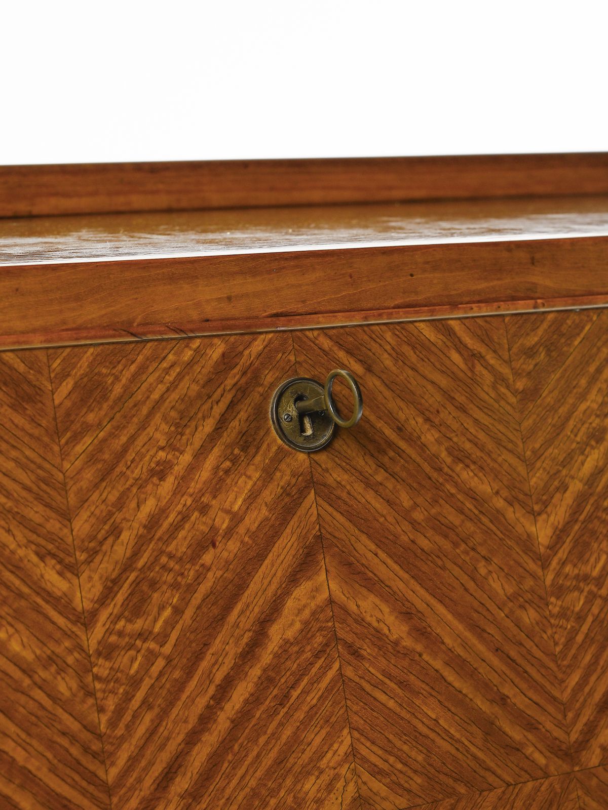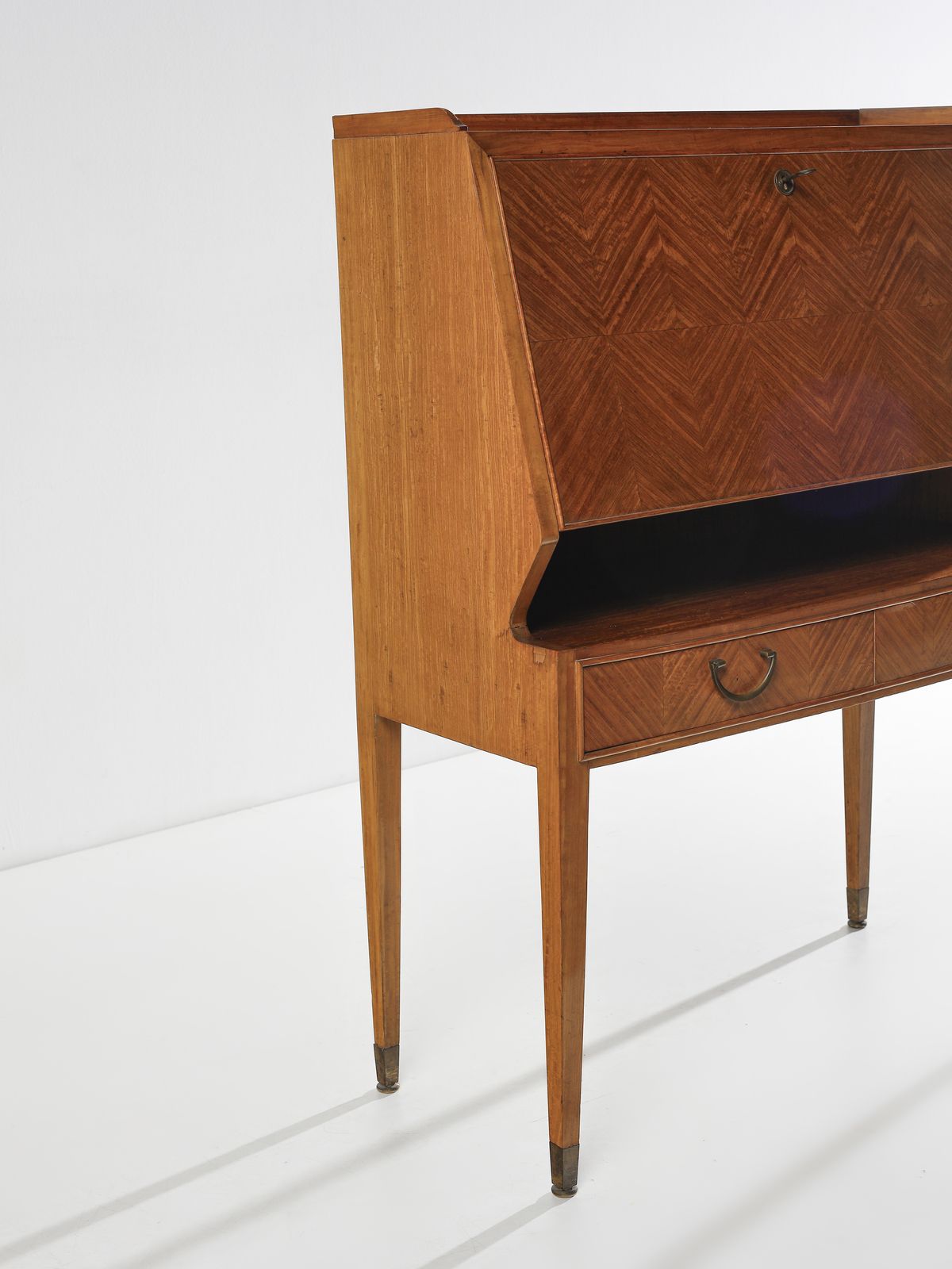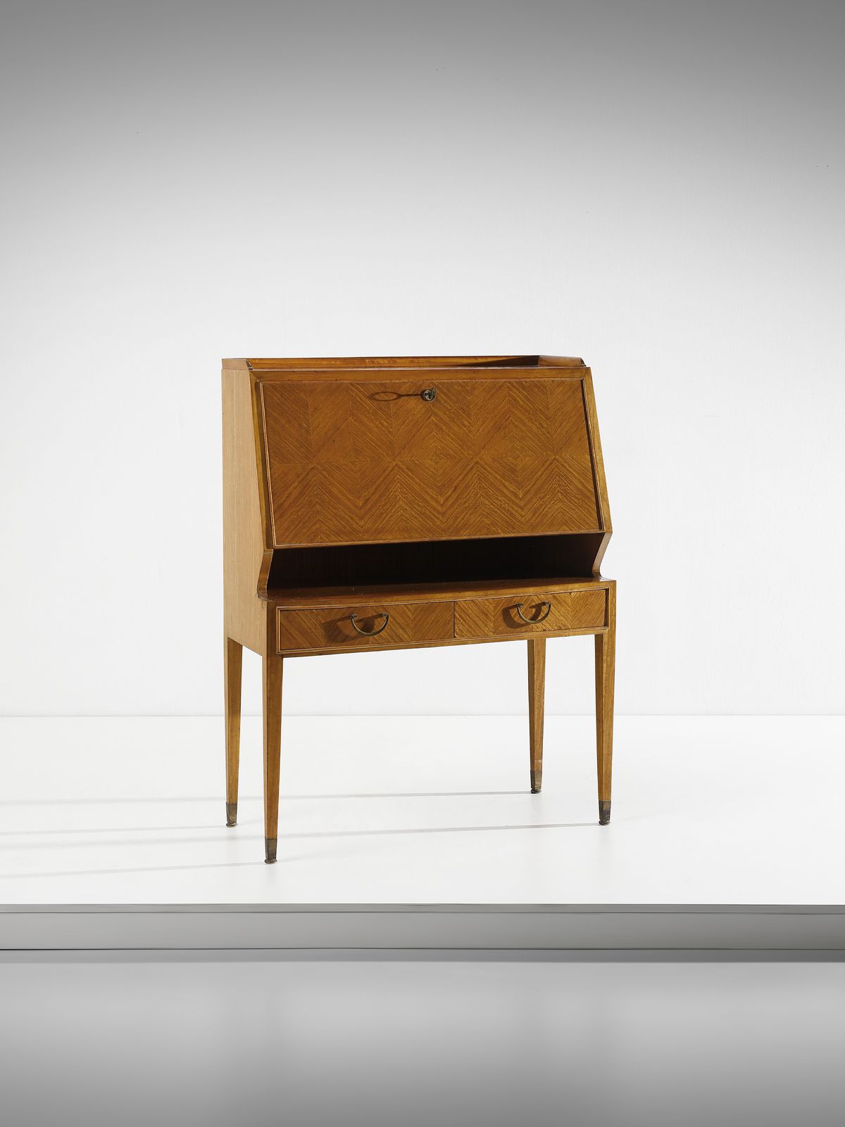 BUFFA PAOLO (1903 - 1970) Scrittoio a ribalta con fronte e cassetti ritmati da un andamento a spina di pesce, esecuzione Serafino Arrighi, Cantù. Legni in varie essenze e ottone.. Cm 119x93x41. 1952-1955.Lotto accompagnato dal certificato di autenticità rilasciato dall'Archivio Paolo Buffa, Cantù.